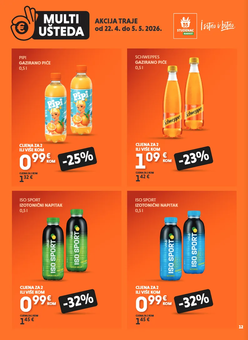 AKCIJA TRAJE od 22. 4. do 5. 5. 2026. 12 ISO SPORT IZOTONIČNI NAPITAK 0,5 l 0 99 1 45 € CIJENA ZA 1 KOM -32% CIJENA ZA 2 ILI VIŠE KOM € KOM PIPI GAZIRANO PIĆE 0,5 l 0 99 1 32 € CIJENA ZA 1 KOM -25% CIJENA ZA 2 ILI VIŠE KOM € KOM 1 09 1 42 € CIJENA ZA 1 KOM -23% CIJENA ZA 2 ILI VIŠE KOM € KOM SCHWEPPES GAZIRANO PIĆE 0,5 l ISO SPORT IZOTONIČNI NAPITAK 0,5 l 0 99 1 45 € CIJENA ZA 1 KOM -32% CIJENA ZA 2 ILI VIŠE KOM € KOM