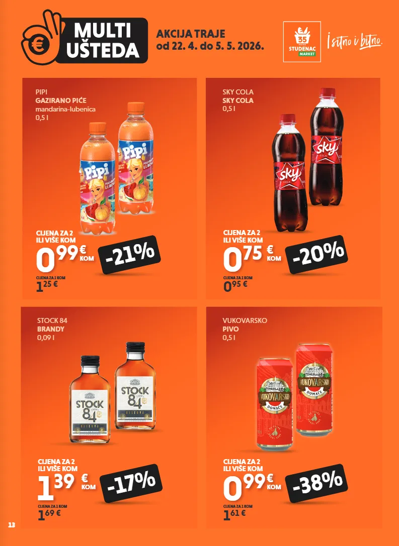 akcija traje od 22. 4. do 5. 5. 2026. 13 pipi gazirano piće mandarina-lubenica 0,5 l 0 99 1 25 € cijena za 1 kom -21% cijena za 2 ili više kom € kom sky cola sky cola 0,5 l 0 75 0 95 € cijena za 1 kom -20% cijena za 2 ili više kom € kom vukovarsko pivo 0,5 l 0 99 1 61 € cijena za 1 kom -38% cijena za 2 ili više kom € kom stock 84 brandy 0,09 l 1 39 1 69 € cijena za 1 kom -17% cijena za 2 ili više kom € kom