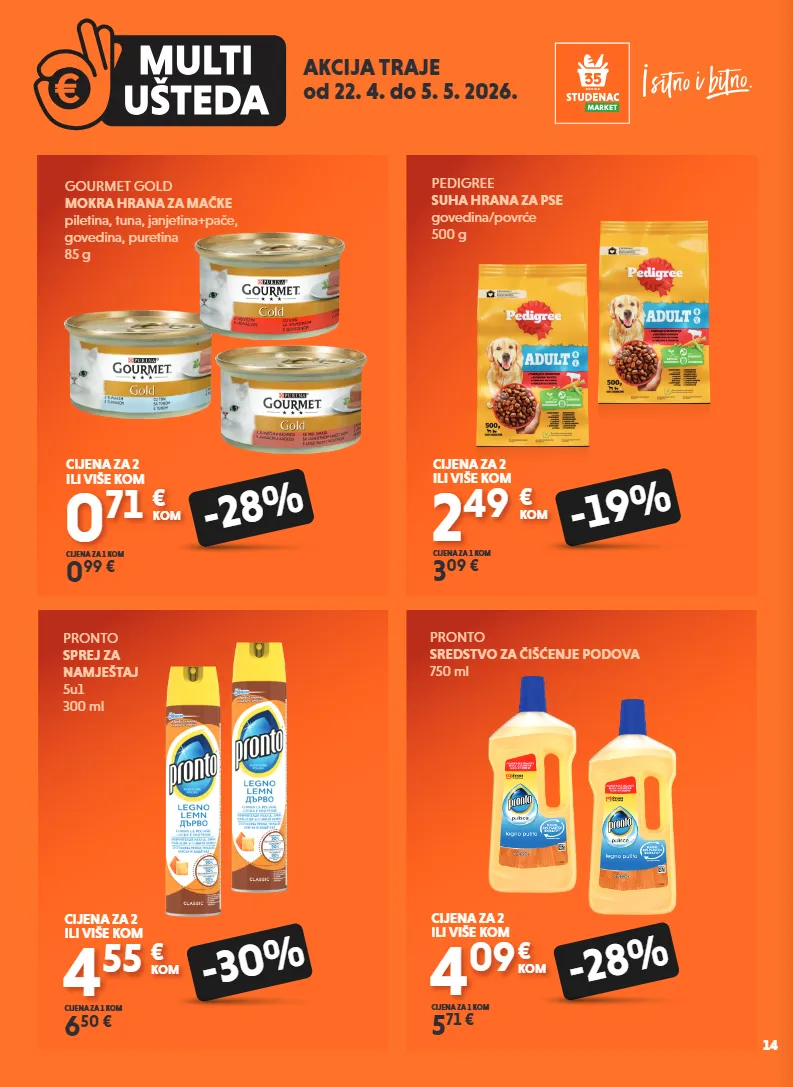 akcija traje od 22. 4. do 5. 5. 2026. 14 gourmet gold mokra hrana za mačke piletina, tuna, janjetina+pače, govedina, puretina 85 g 0 71 0 99 € cijena za 1 kom -28% cijena za 2 ili više kom € kom pedigree suha hrana za pse govedina/povrće 500 g 2 49 3 09 € cijena za 1 kom -19% cijena za 2 ili više kom € kom pronto sprej za namještaj 5u1 300 ml 4 55 6 50 € cijena za 1 kom -30% cijena za 2 ili više kom € kom pronto sredstvo za čišćenje podova 750 ml 4 09 5 71 € cijena za 1 kom -28% cijena za 2 ili više kom € kom