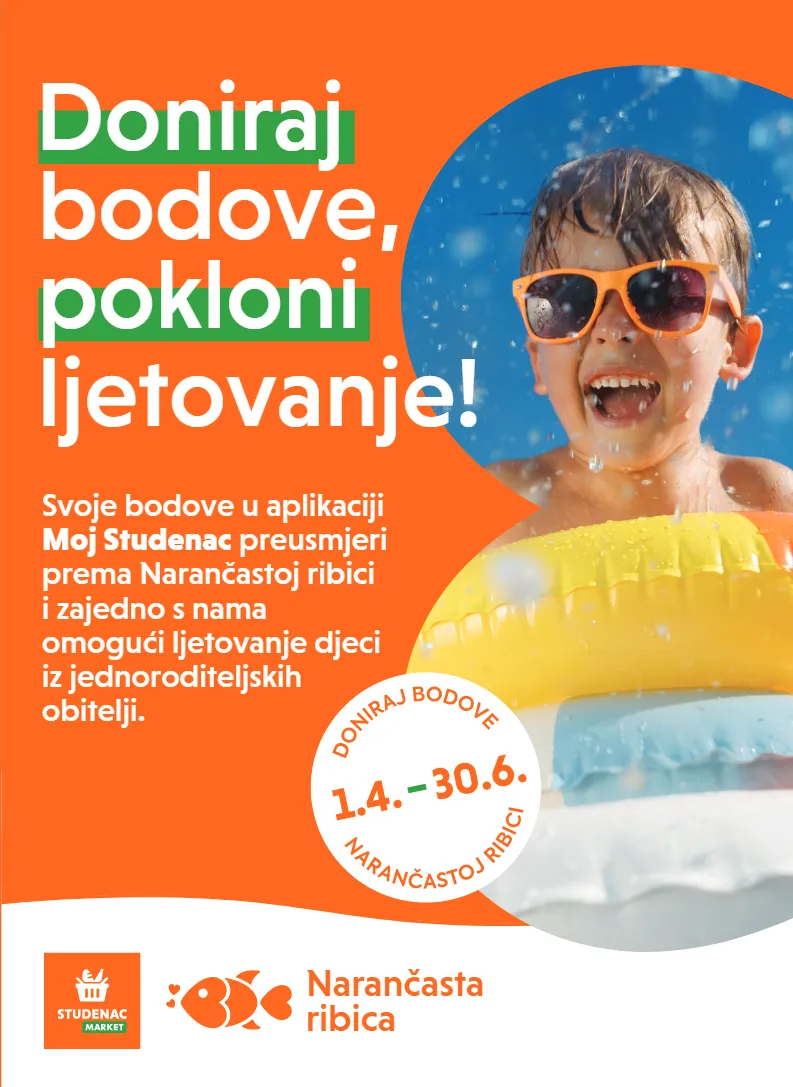 AKCIJA TRAJE od 22. 4. do 5. 5. 2026. 15 Doniraj bodove, pokloni ljetovanje! Svoje bodove u aplikaciji Moj Studenac preusmjeri prema Narančastoj ribici i zajedno s nama omogući ljetovanje djeci iz jednoroditeljskih obitelji. Narančasta ribica