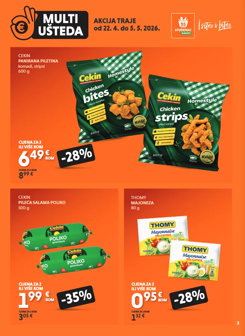 akcija traje od 22. 4. do 5. 5. 2026. 2 cekin pileća salama poliko 500 g 1 99 3 05 € cijena za 1 kom -35% cijena za 2 ili više kom € kom thomy majoneza 80 g 0 95 1 32 € cijena za 1 kom -28% cijena za 2 ili više kom € kom cekin panirana piletina komadi, stripsi 600 g 6 49 8 99 € cijena za 1 kom -28% cijena za 2 ili više kom € kom