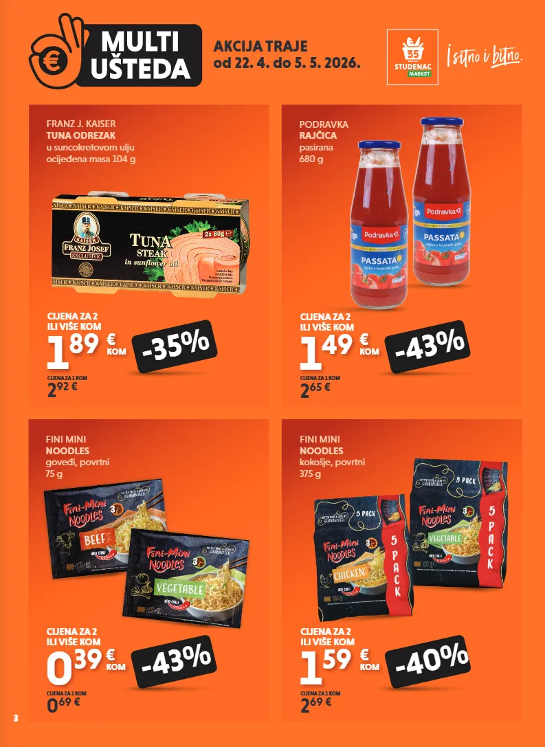 akcija traje od 22. 4. do 5. 5. 2026. 3 podravka rajčica pasirana 680 g 1 49 2 65 € cijena za 1 kom -43% cijena za 2 ili više kom € kom fini mini noodles goveđi, povrtni 75 g 0 39 0 69 € cijena za 1 kom -43% cijena za 2 ili više kom € kom fini mini noodles kokošje, povrtni 375 g 1 59 2 69 € cijena za 1 kom -40% cijena za 2 ili više kom € kom franz j. kaiser tuna odrezak u suncokretovom ulju ocijeđena masa 104 g 1 89 2 92 € cijena za 1 kom -35% cijena za 2 ili više kom € kom
