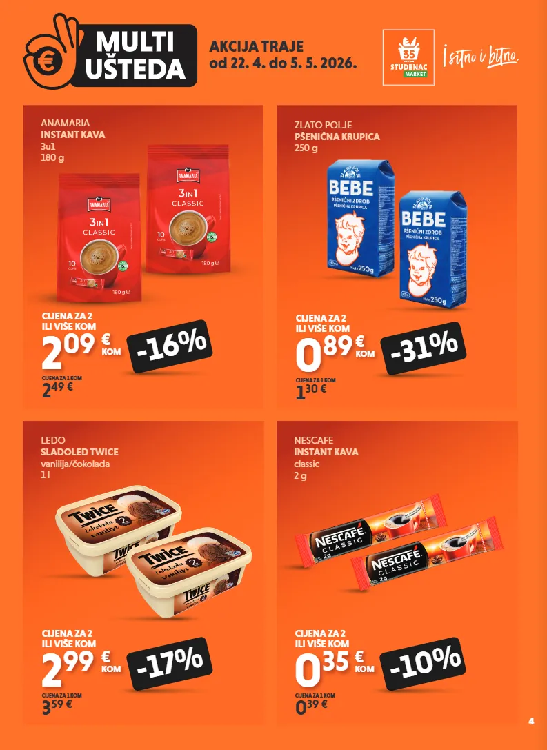 akcija traje od 22. 4. do 5. 5. 2026. 4 ledo sladoled twice vanilija/čokolada 1 l 2 99 3 59 € cijena za 1 kom -17% cijena za 2 ili više kom € kom nescafe instant kava classic 2 g 0 35 0 39 € cijena za 1 kom -10% cijena za 2 ili više kom € kom anamaria instant kava 3u1 180 g 2 09 2 49 € cijena za 1 kom -16% cijena za 2 ili više kom € kom zlato polje pšenična krupica 250 g 0 89 1 30 € cijena za 1 kom -31% cijena za 2 ili više kom € kom