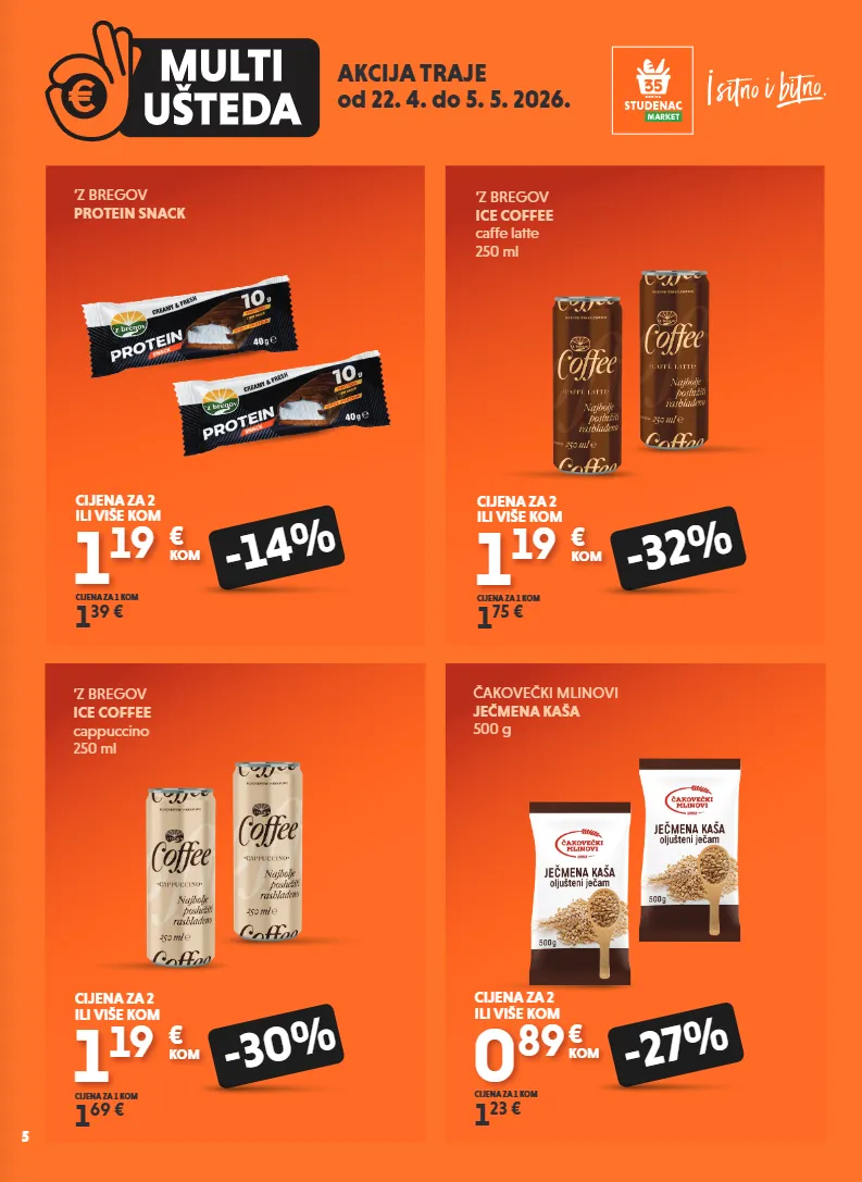 akcija traje od 22. 4. do 5. 5. 2026. 5 ‘z bregov protein snack 1 19 1 39 € cijena za 1 kom -14% cijena za 2 ili više kom € kom ‘z bregov ice coffee caffe latte 250 ml 1 19 1 69 € cijena za 1 kom -30% cijena za 2 ili više kom € kom ‘z bregov ice coffee cappuccino 250 ml 1 19 1 75 € cijena za 1 kom -32% cijena za 2 ili više kom € kom čakovečki mlinovi ječmena kaša 500 g 0 89 1 23 € cijena za 1 kom -27% cijena za 2 ili više kom € kom