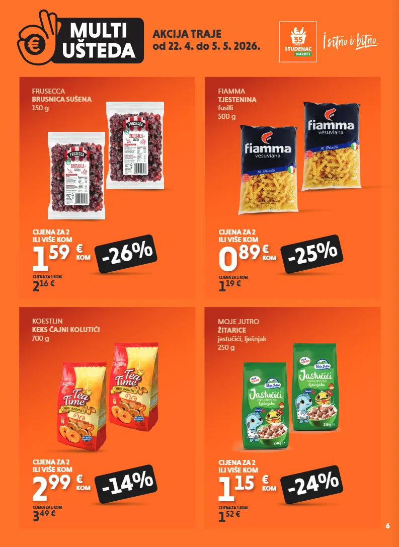 akcija traje od 22. 4. do 5. 5. 2026. 6 fiamma tjestenina fusilli 500 g 0 89 1 19 € cijena za 1 kom -25% cijena za 2 ili više kom € kom frusecca brusnica sušena 150 g 1 59 2 16 € cijena za 1 kom -26% cijena za 2 ili više kom € kom moje jutro žitarice jastučići, lješnjak 250 g 1 15 1 52 € cijena za 1 kom -24% cijena za 2 ili više kom € kom koestlin keks čajni kolutići 700 g 2 99 3 49 € cijena za 1 kom -14% cijena za 2 ili više kom € kom