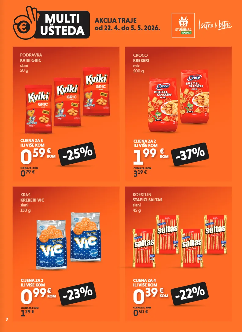 AKCIJA TRAJE od 22. 4. do 5. 5. 2026. 7 PODRAVKA KVIKI GRIC slani 50 g 0 59 0 79 € CIJENA ZA 1 KOM -25% CIJENA ZA 3 ILI VIŠE KOM € KOM CROCO KREKERI mix 500 g 1 99 3 19 € CIJENA ZA 1 KOM -37% CIJENA ZA 2 ILI VIŠE KOM € KOM KRAŠ KREKERI VIC slani 150 g 0 99 1 29 € CIJENA ZA 1 KOM -23% CIJENA ZA 2 ILI VIŠE KOM € KOM KOESTLIN ŠTAPIĆI SALTAS slani 45 g 0 39 0 50 € CIJENA ZA 1 KOM -22% CIJENA ZA 4 ILI VIŠE KOM € KOM