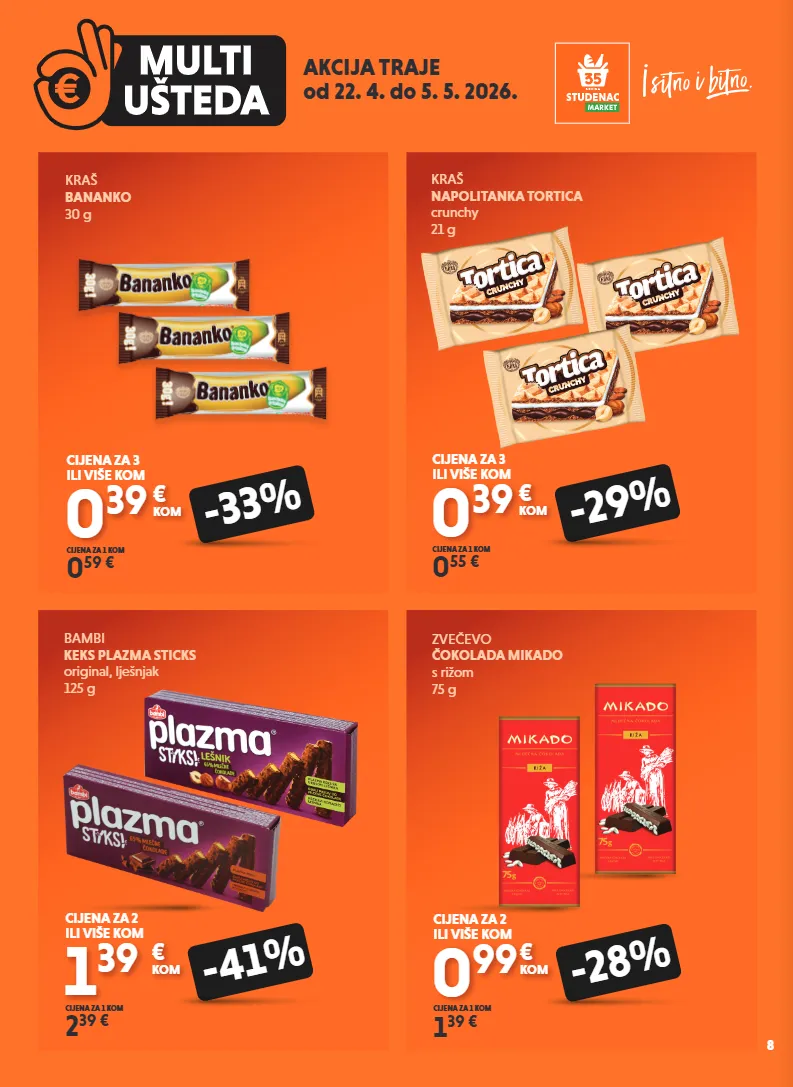 akcija traje od 22. 4. do 5. 5. 2026. 8 kraš bananko 30 g 0 39 0 59 € cijena za 1 kom -33% cijena za 3 ili više kom € kom kraš napolitanka tortica crunchy 21 g 0 39 0 55 € cijena za 1 kom -29% cijena za 3 ili više kom € kom bambi keks plazma sticks original, lješnjak 125 g 1 39 2 39 € cijena za 1 kom -41% cijena za 2 ili više kom € kom zvečevo čokolada mikado s rižom 75 g 0 99 1 39 € cijena za 1 kom -28% cijena za 2 ili više kom € kom