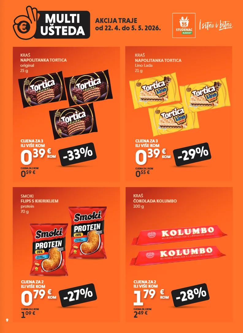 akcija traje od 22. 4. do 5. 5. 2026. 9 kraš napolitanka tortica original 25 g 0 39 0 59 € cijena za 1 kom -33% cijena za 3 ili više kom € kom kraš napolitanka tortica lino lada 21 g 0 39 0 55 € cijena za 1 kom -29% cijena za 3 ili više kom € kom smoki flips s kikirikijem protein 70 g 0 79 1 09 € cijena za 1 kom -27% cijena za 2 ili više kom € kom kraš čokolada kolumbo 100 g 1 79 2 49 € cijena za 1 kom -28% cijena za 2 ili više kom € kom