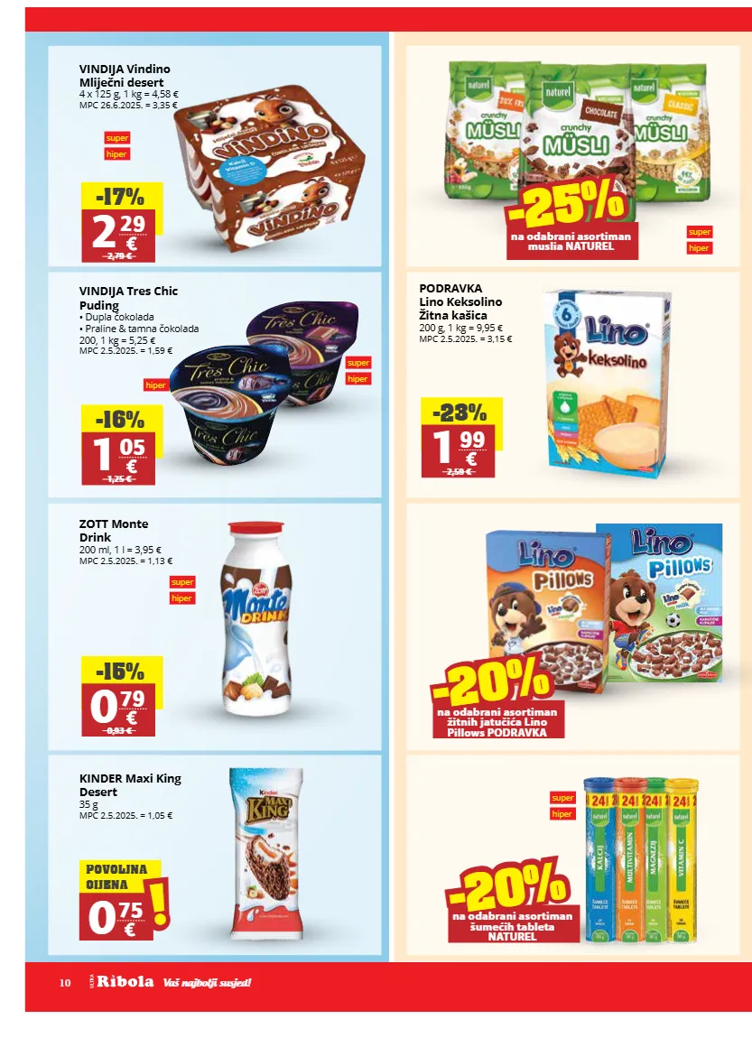 vaš najbolji susjed! super hiper super hiper super hiper super hiper super hiper hiper 10 podravka lino keksolino žitna kašica 200 g, 1 kg = 9,95 € mpc 2.5.2025. = 3,15 € -23% 1 99 2,59 € vindija vindino mliječni desert 4 x 125 g, 1 kg = 4,58 € mpc 26.6.2025. = 3,35 € kinder maxi king desert 35 g mpc 2.5.2025. = 1,05 € zott monte drink 200 ml, 1 l = 3,95 € mpc 2.5.2025. = 1,13 € vindija tres chic puding • dupla čokolada • praline & tamna čokolada 200, 1 kg = 5,25 € mpc 2.5.2025. = 1,59 € -17% 2 29 2,79 € -16% 1 05 1,25 € -15% 0 79 0,93 € 0 75 ! ! povoljna cijena -25% -25% na odabrani asortiman muslia naturel -20% -20% na odabrani asortiman šumećih tableta naturel -25% -20% na odabrani asortiman žitnih jatučića lino pillows podravka