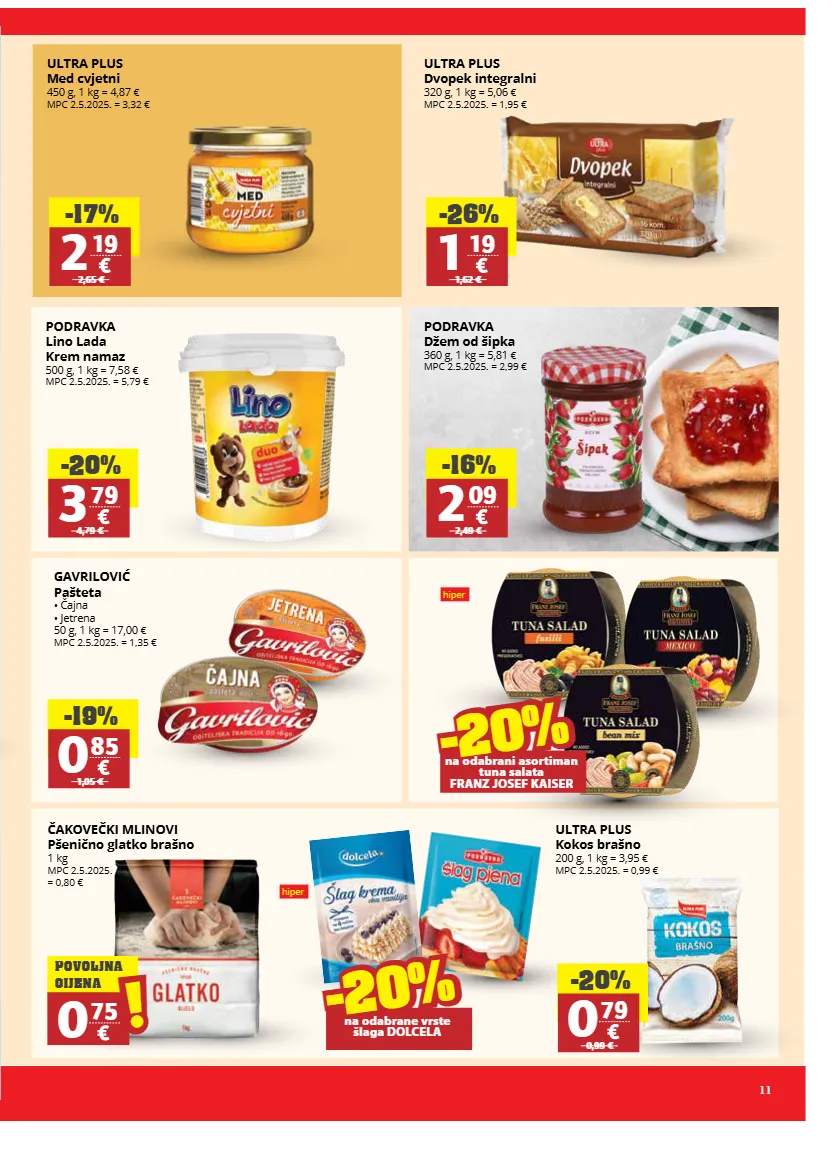 hiper hiper 11 podravka lino lada krem namaz 500 g, 1 kg = 7,58 € mpc 2.5.2025. = 5,79 € ultra plus med cvjetni 450 g, 1 kg = 4,87 € mpc 2.5.2025. = 3,32 € gavrilović pašteta • čajna • jetrena 50 g, 1 kg = 17,00 € mpc 2.5.2025. = 1,35 € podravka džem od šipka 360 g, 1 kg = 5,81 € mpc 2.5.2025. = 2,99 € ultra plus dvopek integralni 320 g, 1 kg = 5,06 € mpc 2.5.2025. = 1,95 € -20% 3 79 4,79 € -17% 2 19 2,65 € -16% 2 09 2,49 € -26% 1 19 1,62 € -19% 0 85 1,05 € ultra plus kokos brašno 200 g, 1 kg = 3,95 € mpc 2.5.2025. = 0,99 € -20% 0 79 0,99 € čakovečki mlinovi pšenično glatko brašno 1 kg mpc 2.5.2025. = 0,80 € 0 75 ! ! povoljna cijena -25% -20% na odabrani asortiman tuna salata franz josef kaiser -20% -20% na odabrane vrste šlaga dolcela