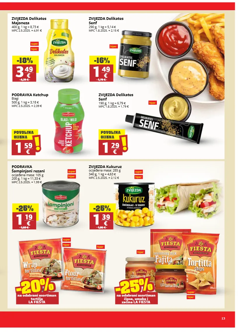13 super hiper super hiper hiper hiper super hiper super hiper super hiper hiper hiper zvijezda delikates majoneza 400 g, 1 kg = 8,73 € mpc 2.5.2025. = 4,91 € podravka šampinjoni rezani ocijeđena masa: 105 g 200 g, 1 kg = 11,33 € mpc 2.5.2025. = 1,99 € zvijezda kukuruz ocijeđena masa: 285 g 340 g, 1 kg = 4,63 € mpc 2.5.2025. = 2,12 € zvijezda delikates senf 290 g, 1 kg = 5,14 € mpc 1.8.2025. = 2,15 € zvijezda delikates senf 190 g, 1 kg = 6,79 € mpc 1.8.2025. = 1,79 € podravka ketchup blagi 500 g, 1 kg = 3,18 € mpc 2.5.2025. = 2,39 € -18% 3 49 4,29 € -16% 1 49 1,79 € -25% 1 19 1,60 € -25% 1 39 1,86 € 1 29 ! ! povoljna cijena 1 59 ! ! povoljna cijena -20% -20% na odabrani asortiman tortilja la fiesta -25% -25% na odabrani asortiman čipsa, umaka i začina la fiesta
