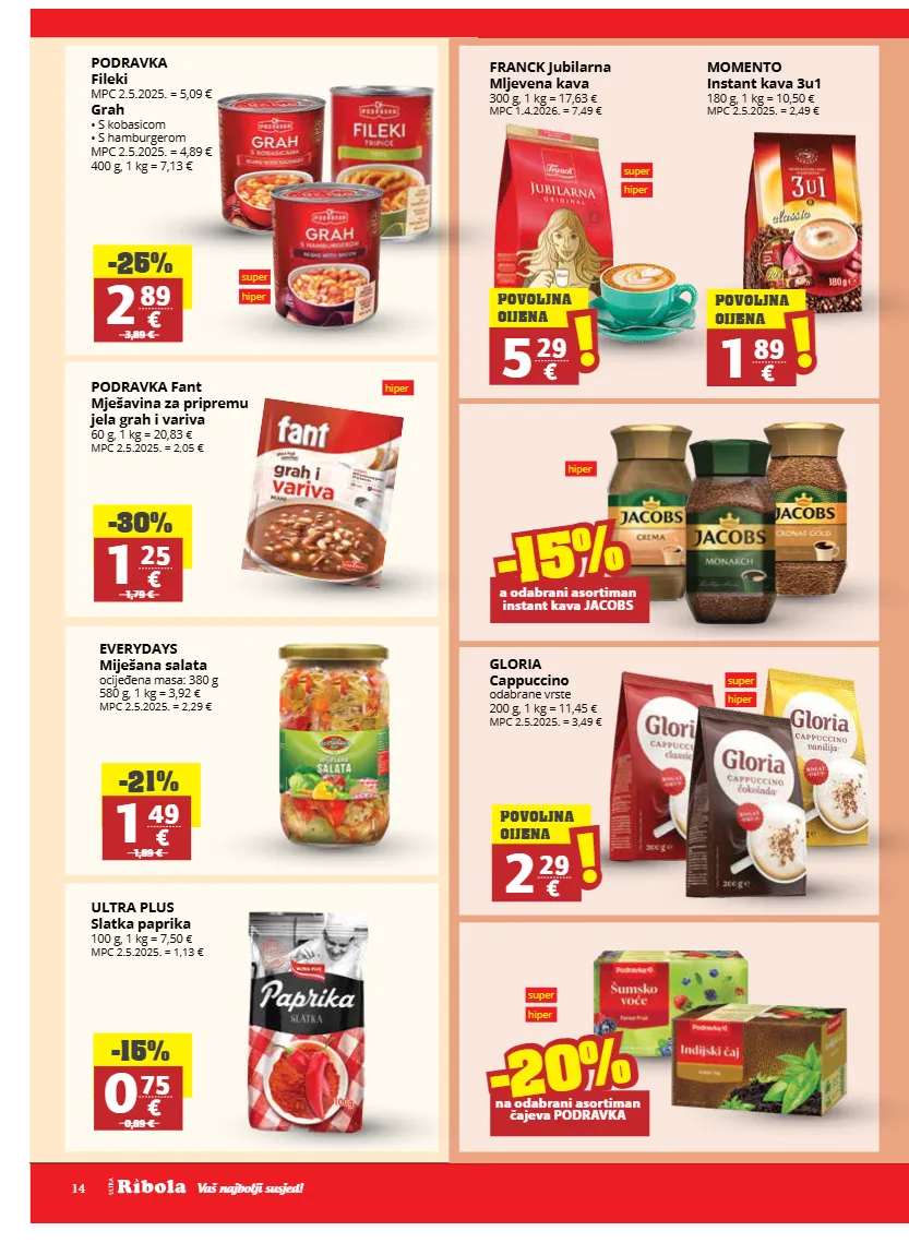 vaš najbolji susjed! 14 super hiper super hiper super hiper super hiper hiper hiper podravka fileki mpc 2.5.2025. = 5,09 € grah • s kobasicom • s hamburgerom mpc 2.5.2025. = 4,89 € 400 g, 1 kg = 7,13 € podravka fant mješavina za pripremu jela grah i variva 60 g, 1 kg = 20,83 € mpc 2.5.2025. = 2,05 € ultra plus slatka paprika 100 g, 1 kg = 7,50 € mpc 2.5.2025. = 1,13 € franck jubilarna mljevena kava 300 g, 1 kg = 17,63 € mpc 1.4.2026. = 7,49 € momento instant kava 3u1 180 g, 1 kg = 10,50 € mpc 2.5.2025. = 2,49 € gloria cappuccino odabrane vrste 200 g, 1 kg = 11,45 € mpc 2.5.2025. = 3,49 € -25% 2 89 3,89 € everydays miješana salata ocijeđena masa: 380 g 580 g, 1 kg = 3,92 € mpc 2.5.2025. = 2,29 € -21% 1 49 1,89 € -30% 1 25 1,79 € -15% 0 75 0,89 € 1 89 ! ! povoljna cijena 5 29 ! ! povoljna cijena 2 29 ! ! povoljna cijena -20% -20% na odabrani asortiman čajeva podravka -15% -15% a odabrani asortiman instant kava jacobs