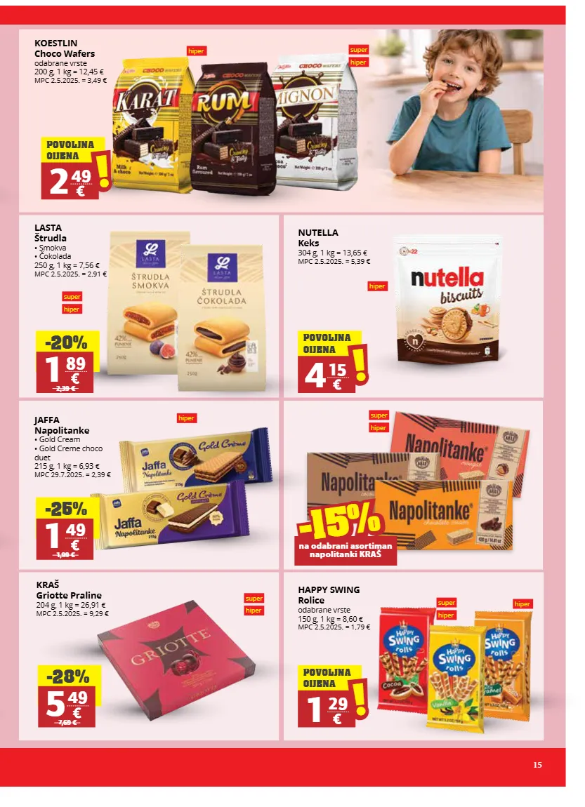 15 super hiper hiper super hiper super hiper super hiper hiper hiper hiper kraš griotte praline 204 g, 1 kg = 26,91 € mpc 2.5.2025. = 9,29 € lasta štrudla • smokva • čokolada 250 g, 1 kg = 7,56 € mpc 2.5.2025. = 2,91 € koestlin choco wafers odabrane vrste 200 g, 1 kg = 12,45 € mpc 2.5.2025. = 3,49 € jaffa napolitanke • gold cream • gold creme choco duet 215 g, 1 kg = 6,93 € mpc 29.7.2025. = 2,39 € happy swing rolice odabrane vrste 150 g, 1 kg = 8,60 € mpc 2.5.2025. = 1,79 € -28% 5 49 7,69 € -25% 1 49 1,99 € -20% 1 89 2,39 € nutella keks 304 g, 1 kg = 13,65 € mpc 2.5.2025. = 5,39 € 4 15 ! ! povoljna cijena 1 29 ! ! povoljna cijena 2 49 ! ! povoljna cijena super hiper -15% -15% na odabrani asortiman napolitanki kraš