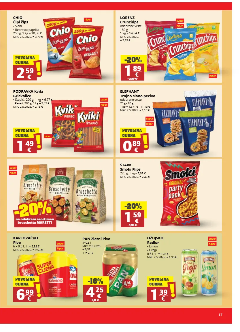 17 super hiper super hiper super hiper super hiper super hiper super hiper super hiper super hiper super hiper super hiper super hiper super hiper hiper hiper hiper 2 59 ! ! povoljna cijena 1 49 ! ! povoljna cijena 0 89 ! ! povoljna cijena -20% -20% na odabrani asortiman bruschetta maretti chio čipi čips • slani • rebrasta paprika 250 g, 1 kg = 10,36 € mpc 2.5.2025. = 3,79 € lorenz crunchips odabrane vrste 130 g 1 kg = 14,54 € mpc 2.5.2025. = 2,85 € podravka kviki grickalice • štapići, 220 g, 1 kg = 6,77 € • pereci, 200 g, 1 kg = 7,45 € mpc 2.5.2025. = 2,15 € elephant trajno slano pecivo odabrane vrste 70 g - 80 g 1 kg = 12,71 € - 11,13 € mpc 2.5.2025. = 1,19 € štark smoki flips 225 g, 1 kg = 7,07 € mpc 2.5.2025. = 2,45 € karlovačko pivo 6 x 0,5 l, 1 l = 2,33 € mpc 2.5.2025. = 9,53 € ožujsko radler • limun • grejp 0,5 l, 1 l = 2,78 € mpc 2.5.2025. = 1,95 € pan zlatni pivo 4*0,5 l mpc 2.5.2025 = 6,37 1 l= 2,13 -20% 1 89 2,39 € -20% 1 59 1,99 € -16% 4 25 5,11 € 6 99 ! ! povoljna cijena 1 39 ! ! povoljna cijena
