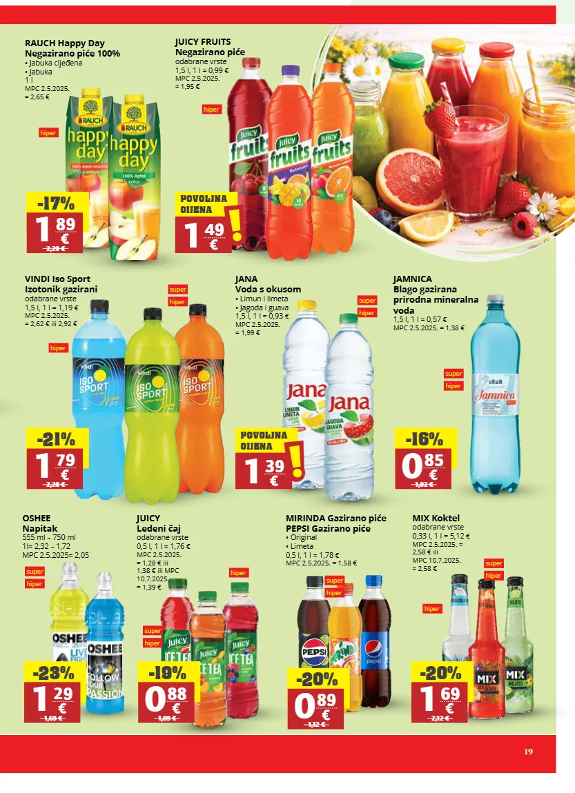 19 super hiper super hiper super hiper super hiper hiper super hiper super hiper hiper hiper hiper hiper rauch happy day negazirano piće 100% • jabuka cijeđena • jabuka 1 l mpc 2.5.2025. = 2,65 € juicy fruits negazirano piće odabrane vrste 1,5 l, 1 l = 0,99 € mpc 2.5.2025. = 1,95 € vindi iso sport izotonik gazirani odabrane vrste 1,5 l, 1 l = 1,19 € mpc 2.5.2025. = 2,62 € ili 2,92 € jamnica blago gazirana prirodna mineralna voda 1,5 l, 1 l = 0,57 € mpc 2.5.2025. = 1,38 € mix koktel odabrane vrste 0,33 l, 1 l = 5,12 € mpc 2.5.2025. = 2,58 € ili mpc 10.7.2025. = 2,58 € oshee napitak 555 ml – 750 ml 1l= 2,32 – 1,72 mpc 2.5.2025= 2,05 juicy ledeni čaj odabrane vrste 0,5 l, 1 l = 1,76 € mpc 2.5.2025. = 1,28 € ili 1,38 € ili mpc 10.7.2025. = 1,39 € -17% 1 89 2,29 € -19% 0 88 1,09 € -21% 1 79 2,28 € super hiper mirinda gazirano piće pepsi gazirano piće • original • limeta 0,5 l, 1 l = 1,78 € mpc 2.5.2025. = 1,58 € -20% 0 89 1,12 € -16% 0 85 1,02 € -20% 1 69 2,12 € -23% 1 29 1,69 € 1 49 ! ! povoljna cijena jana voda s okusom • limun i limeta • jagoda i guava 1,5 l, 1 l = 0,93 € mpc 2.5.2025. = 1,99 € 1 39 ! ! povoljna cijena