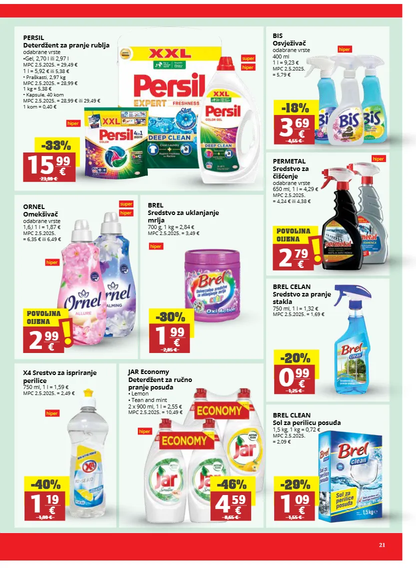 21 ornel omekšivač odabrane vrste 1,6,l 1 l = 1,87 € mpc 2.5.2025. = 6,35 € ili 6,49 € brel clean sol za perilicu posuđa 1,5 kg, 1 kg = 0,72 € mpc 2.5.2025. = 2,09 € x4 srestvo za ispriranje perilice 750 ml, 1 l = 1,59 € mpc 2.5.2025. = 2,49 € permetal sredstvo za čišćenje odabrane vrste 650 ml, 1 l = 4,29 € mpc 2.5.2025. = 4,24 € ili 4,38 € brel celan sredstvo za pranje stakla 750 ml, 1 l = 1,32 € mpc 2.5.2025. = 1,69 € jar economy deterdžent za ručno pranje posuđa • lemon • tean and mint 2 x 900 ml, 1 l = 2,55 € mpc 2.5.2025. = 10,49 € bis osvježivač odabrane vrste 400 ml 1 l = 9,23 € mpc 2.5.2025. = 5,79 € brel sredstvo za uklanjanje mrlja 700 g, 1 kg = 2,84 € mpc 2.5.2025. = 3,49 € persil deterdžent za pranje rublja odabrane vrste •gel, 2,70 l ili 2,97 l mpc 2.5.2025. = 29,49 € 1 l = 5,92 € ili 5,38 € • praškasti, 2,97 kg mpc 2.5.2025. = 28,99 € 1 kg = 5,38 € • kapsule, 40 kom mpc 2.5.2025. = 28,99 € ili 29,49 € 1 kom = 0,40 € -18% 3 69 4,55 € -46% 4 59 8,65 € -29% 1 09 1,55 € -40% 1 19 1,99 € -20% 0 99 1,25 € -30% 1 99 2,85 € -33% 15 99 23,99 € 2 99 ! ! povoljna cijena 2 79 ! ! povoljna cijena super hiper super hiper hiper hiper hiper hiper hiper hiper hiper