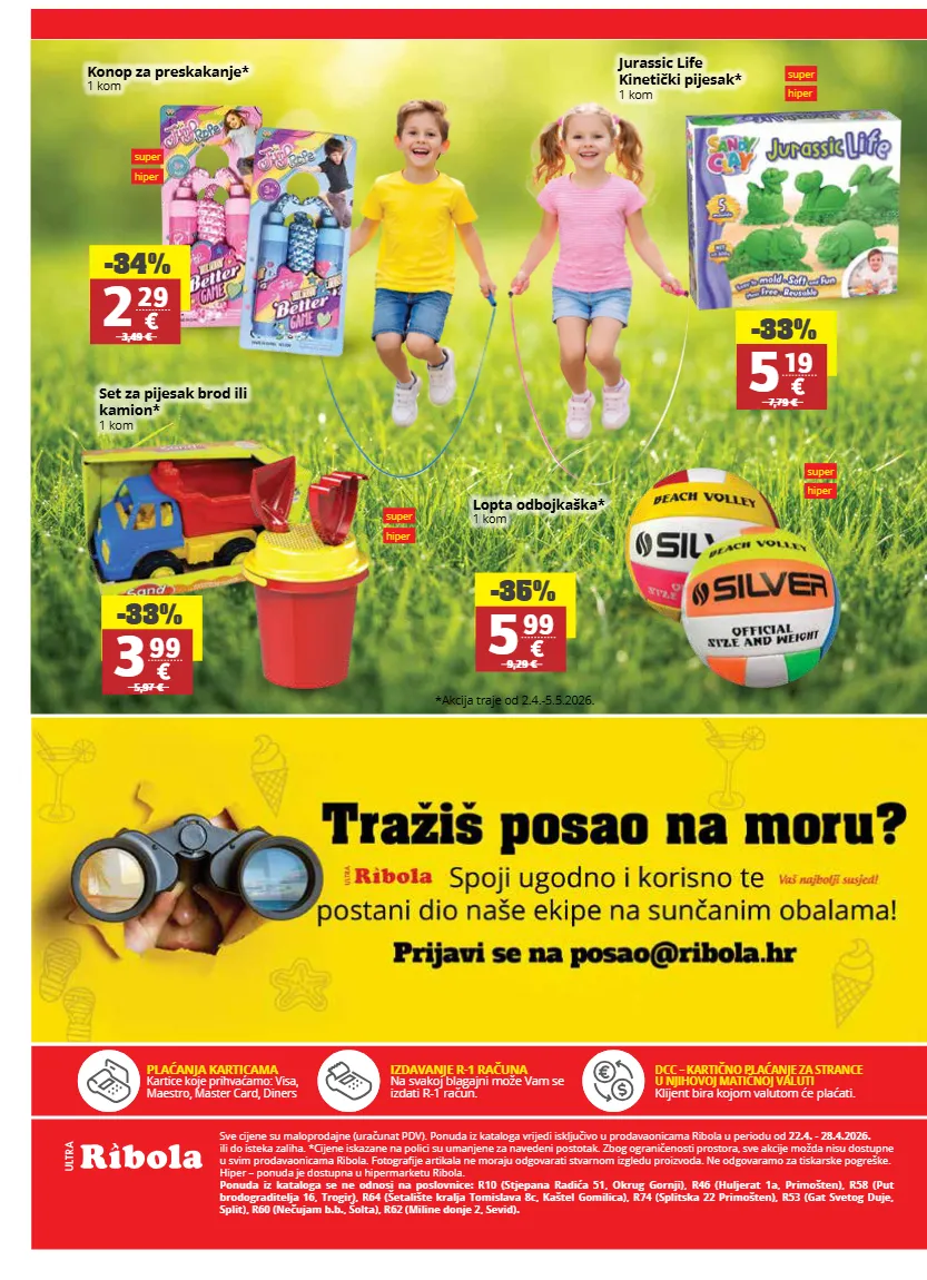 *akcija traje od 2.4.-5.5.2026. plaćanja karticama kartice koje prihvaćamo: visa, maestro, master card, diners izdavanje r-1 računa na svakoj blagajni može vam se izdati r-1 račun. dcc – kartično plaćanje za strance u njihovoj matičnoj valuti klijent bira kojom valutom će plaćati. sve cijene su maloprodajne (uračunat pdv). ponuda iz kataloga vrijedi isključivo u prodavaonicama ribola u periodu od 22.4. - 28.4.2026. ili do isteka zaliha. *cijene iskazane na polici su umanjene za navedeni postotak. zbog ograničenosti prostora, sve akcije možda nisu dostupne u svim prodavaonicama ribola. fotografije artikala ne moraju odgovarati stvarnom izgledu proizvoda. ne odgovaramo za tiskarske pogreške. hiper – ponuda je dostupna u hipermarketu ribola. ponuda iz kataloga se ne odnosi na poslovnice: r10 (stjepana radića 51, okrug gornji), r46 (huljerat 1a, primošten), r58 (put brodograditelja 16, trogir), r64 (šetalište kralja tomislava 8c, kaštel gomilica), r74 (splitska 22 primošten), r53 (gat svetog duje, split), r60 (nečujam b.b., šolta), r62 (miline donje 2, sevid). lopta odbojkaška* 1 kom konop za preskakanje* 1 kom jurassic life kinetički pijesak* 1 kom set za pijesak brod ili kamion* 1 kom -35% 5 99 9,29 € -34% 2 29 3,49 € -33% 5 19 7,79 € -33% 3 99 5,97 € super hiper super hiper super hiper super hiper