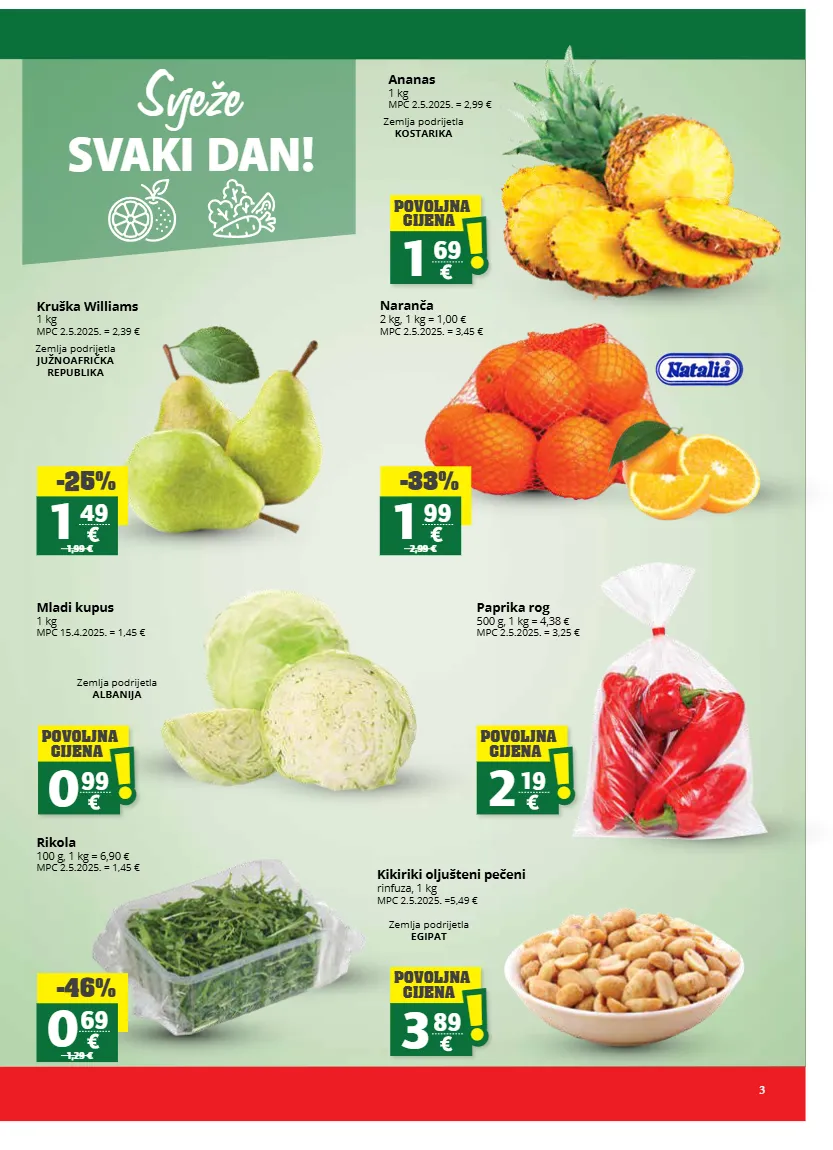 svježe svaki dan! 3 1 69 povoljna cijena ! ! 0 99 povoljna cijena ! ! 3 89 povoljna cijena ! ! 2 19 povoljna cijena ! ! -25% 1 49 1,99 € -33% 1 99 2,99 € -46% 0 69 1,29 € zemlja podrijetla kostarika zemlja podrijetla južnoafrička republika zemlja podrijetla albanija zemlja podrijetla egipat ananas 1 kg mpc 2.5.2025. = 2,99 € kruška williams 1 kg mpc 2.5.2025. = 2,39 € naranča 2 kg, 1 kg = 1,00 € mpc 2.5.2025. = 3,45 € mladi kupus 1 kg mpc 15.4.2025. = 1,45 € paprika rog 500 g, 1 kg = 4,38 € mpc 2.5.2025. = 3,25 € rikola 100 g, 1 kg = 6,90 € mpc 2.5.2025. = 1,45 € kikiriki oljušteni pečeni rinfuza, 1 kg mpc 2.5.2025. =5,49 €