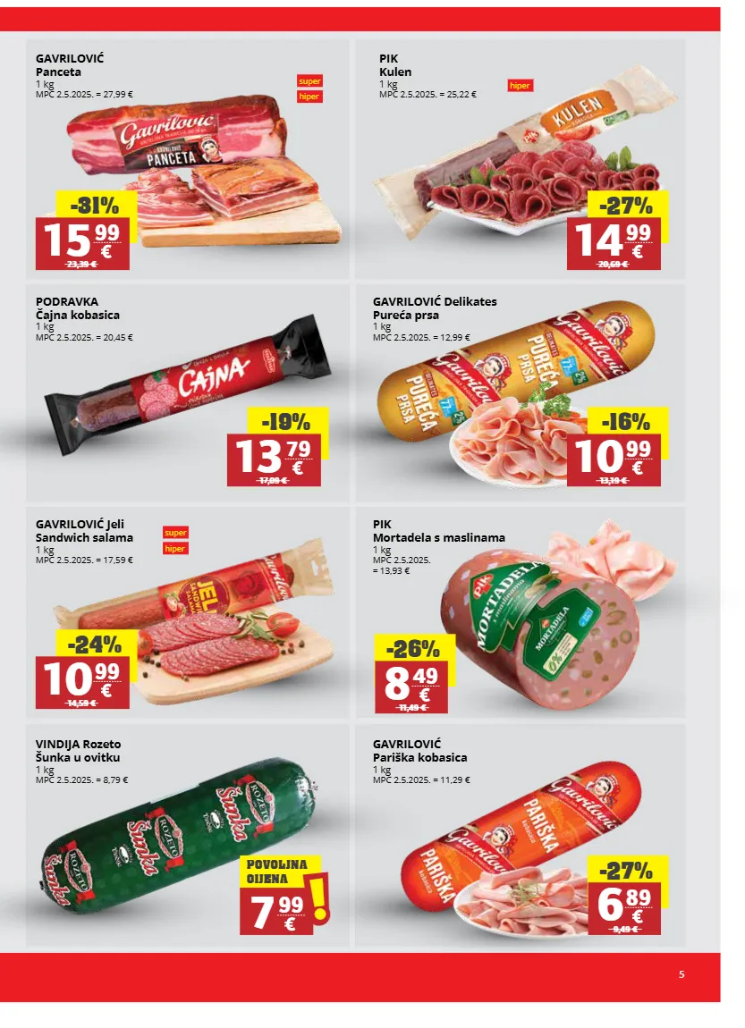 vaš najbolji susjed! 6 super hiper super hiper super hiper hiper pik kobasica čajna mpc 2.5.2025. = 8,49 € zimska salama mpc 2.5.2025. = 9,62 € 330 g, 1 kg = 17,24 € gavrilović jeli pileći parizer 350 g, 1 kg = 3,11 € mpc 2.5.2025. = 2,19 € voštane dalmatiko pršut narezak 80 g, 1 kg = 26,13 € mpc 2.5.2025. = 3,59 € pik šunka u ovitku narezak 125 g, 1 kg = 15,92 € mpc 2.5.2025. = 3,05 € dobro naresci odabrane vrste 80 g, 1 kg = 21,13 € mpc 2.5.2025. = 2,59 € pik debrecinka kobasica 440 g, 1 kg = 7,93 € mpc 2.5.2025. = 5,29 € gavrilović hrenovke 200 g, 1 kg = 9,45 € mpc 2.5.2025. = 2,95 € vindija cekin pileće hrenovke 300 g, 1 kg = 5,97 € mpc 2.5.2025. = 2,39 € 5 69 ! ! povoljna cijena 1 79 ! ! povoljna cijena -37% 1 09 1,75 € -25% 2 09 2,79 € -15% 1 69 1,99 € -20% 3 49 4,39 € -20% 1 89 2,39 € -20% 1 99 2,49 €