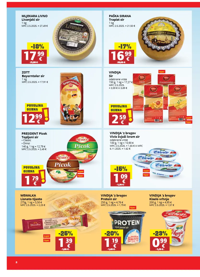 vaš najbolji susjed! 8 super hiper super hiper hiper super hiper hiper mljekara livno livanjski sir 1 kg mpc 2.5.2025. = 27,49 € paška sirana trapist sir 1 kg mpc 2.5.2025. = 21,50 € vindija sir odabrane vrste 150 g, 1 kg = 17,27 € mpc 2.5.2025. = 3,59 € ili 3,89 € vindija ‘z bregov vivis svježi krem sir odabrane vrste 100 g, 1 kg = 10,90 € mpc 2.5.2025. = 1,65 € ili mpc 6.11.2025. = 1,62 € vindija ‘z bregov protein sir 250 g, 1 kg = 4,76 € mpc 2.5.2025. = 1,79 € vindija ‘z bregov kiselo vrhnje 200 g, 1 kg = 4,95 € mpc 2.5.2025. = 1,57 € president picok topljeni sir • classic • dimsi 140 g, 1 kg = 12,79 € mpc 2.5.2025. = 2,49 € -18% 17 99 21,99 € -17% 16 99 20,69 € zott bayerntaler sir 1 kg mpc 2.5.2025. = 17,91 € 12 99 ! ! povoljna cijena 2 59 ! ! povoljna cijena 1 79 ! ! povoljna cijena -15% 1 09 1,29 € -20% 1 19 1,49 € super hiper wewalka lisnato tijesto 275g, 1 kg = 5,50 € mpc 2.5.2025. = 2,25 € -25% 1 39 1,86 € -23% 0 99 1,29 €