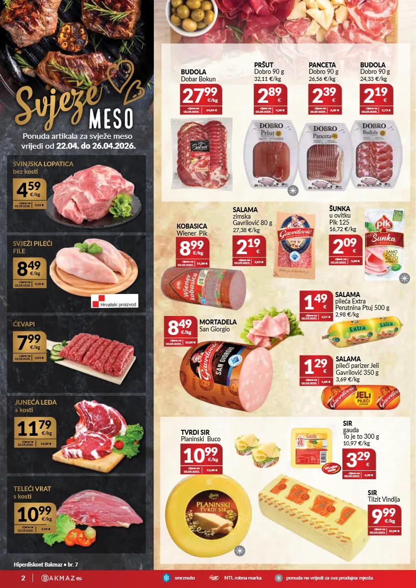 2 smrznutontl r o b n a m a r k a p o n u d a n e v r i j e d i z a s v a p r o d a j n a m j e s t a ntl robna marka hiperdiskont bakmaz • br. 7 ponuda artikala za svježe meso vrijedi od 22.04. do 26.04.2026. svježe meso pršut dobro 90 g 32,11 €/kg 2 89 € cijena na 02.05.2025. 4,29 € panceta dobro 90 g 26,56 €/kg 2 39 € cijena na 26.09.2025. 3,39 € buđola dobro 90 g 24,33 €/kg 2 19 € cijena na 02.05.2025. 2,75 € svinjska lopatica bez kosti 4 59 €/kg cijena na 02.05.2025. 5,99 € ćevapi 7 99 €/kg cijena na 02.05.2025. 6,90 € svježi pileći file 8 49 €/kg cijena na 02.05.2025. 9,29 € juneća leđa s kosti 11 79 €/kg cijena na 02.05.2025. 10,69 € teleći vrat s kosti 10 99 €/kg cijena na 02.05.2025. 9,99 € 3 29 € cijena na 02.05.2025. 4,29 € sir gauda to je to 300 g 10,97 €/kg tvrdi sir planinski buco 10 99 €/kg cijena na 02.05.2025. 12,49 € 9 99 €/kg cijena na 02.05.2025. 12,99 € sir tilzit vindija 8 99 €/kg cijena na 02.05.2025. 11,89 € kobasica wiener pik 8 49 €/kg cijena na 02.05.2025. 12,39 € mortadela san giorgio salama pileći parizer jeli gavrilović 350 g 3,69 €/kg 1 29 € cijena na 02.05.2025. 1,85 € salama pileća extra perutnina ptuj 500 g 2,98 €/kg 1 49 € cijena na 02.05.2025. 2,17 € ntl robna marka salama zimska gavrilović 80 g 27,38 €/kg 2 19 € cijena na 02.05.2025. 2,95 € šunka u ovitku pik 125 16,72 €/kg 2 09 € cijena na 02.05.2025. 2,60 € buđola dobar bokun 27 99 €/kg cijena na 02.05.2025. 34,99 €