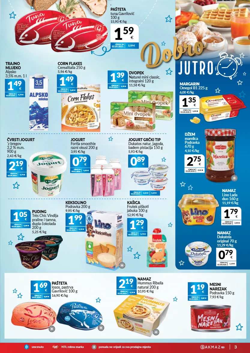 3 smrznutontl r o b n a m a r k a p o n u d a n e v r i j e d i z a s v a p r o d a j n a m j e s t a ntl robna marka dobro jutro 1 19 € cijena na 02.05.2025. 2,09 € mesni narezak podravka 150 g 7,93 €/kg 1 79 € cijena na 02.05.2025. 2,39 € namaz lino lada duo 160 g 11,19 €/kg 0 79 € cijena na 02.05.2025. 1,15 € namaz dukatela original 70 g 11,29 €/kg 1 35 € cijena na 02.05.2025. 1,99 € margarin omegol b1 225 g 6,00 €/kg 2 75 € cijena na 02.05.2025. 3,99 € džem marelica podravka 670 g 4,10 €/kg kašica frutek piškoti jabuka 100 g 12,90 €/kg 1 29 € cijena na 02.05.2025. 1,75 € cijena na 02.05.2025. 1,49 € 1 05 € puding très chic vindija praline i tamna, dupla čokolada 200 g 5,25 €/kg cijena na 02.05.2025. 2,79 € 1 99 € keksolino podravka 200 g 9,95 €/kg 2 19 € cijena na 02.05.2025. 2,79 € namaz hummus ribella natural 200 g 10,95 €/kg 1 69 € cijena na 26.01.2026. 3,35 € pašteta losos, pastrva gavrilović 100 g 16,90 €/kg 1 49 € cijena na 02.05.2025. 1,79 € trajno mlijeko alpsko 3,5% m.m. 1 l 1 49 € cijena na 02.05.2025. 1,49 € corn flakes cerealitalia 250 g 5,96 €/kg 1 39 € cijena na 02.05.2025. 1,55 € dvopek naturel mini classic, integralni 120 g 11,58 €/kg cijena na 02.05.2025. 2,19 € pašteta tuna gavrilović 100 g 15,90 €/kg 1 59 € 0 79 € cijena na 29.01.2026. 1,35 € jogurt fortia smoothie razni okusi 200 g 3,95 €/kg 2 19 € cijena na 02.05.2025. 2,74 € čvrsti jogurt ‘z bregov 3,2 % m.m. 900 g 2,43 €/kg 0 89 € jogurt grčki tip dukatos natur, jagoda, badem pistacija 150 g 5,93 €/kg cijena na 02.05.2025. 1,15 € 1,19 €