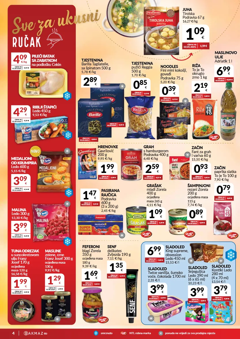 4 smrznutontl r o b n a m a r k a p o n u d a n e v r i j e d i z a s v a p r o d a j n a m j e s t a ntl robna marka sve za ukusni ručak juha tirolska podravka 67 g 16,27 €/kg 1 09 € cijena na 02.05.2025. 1,59 € 1 99 € cijena na 02.05.2025. 2,39 € tuna odrezak u suncokretovom ulju franz josef 170 g ocijeđena masa 120 g 16,58 €/kg 4 29 € cijena na 02.05.2025. 5,29 € riblji štapići ledo 450 g 9,53 €/kg 4 09 €/kg cijena na 02.05.2025. 5,99 € pileći batak sa zabatkom na podlošku cekin cijena na 02.05.2025. 5,25 € 3 99 € malina ledo 300 g 13,30 €/kg cijena na 02.05.2025. 3,33 € cijena na 02.05.2025. 3,45 € 2 89 € tjestenina barilla tagliatelle, sa špinatom 500 g 5,78 €/kg 6 99 € cijena na 02.05.2025. 10,99 € maslinovo ulje adriatik 1 l 0 85 € cijena na 02.05.2025. 1,15 € tjestenina pužići reggia 500 g 1,70 €/kg 0 39 € cijena na 02.05.2025. 0,73 € noodles fini mini kokošji, goveđi podravka 75 g 5,20 €/kg 2 19 € cijena na 02.05.2025. 2,49 € riža to je to okruglo zrno 1 kg 1 09 € cijena na 02.05.2025. 1,49 € grašak mladi zorela 400 g ocijeđena masa 265 g 4,11 €/kg 0 89 € cijena na 02.05.2025. 0,99 € šampinjoni rezani zorela 200 g ocijeđena masa 115 g 7,74 €/kg 1 69 € cijena na 02.05.2025. 2,19 € feferoni blagi zorela 350 g ocijeđena masa 180 g 9,39 €/kg 0 79 € cijena na 02.05.2025. 0,93 € začin paprika slatka to je to 100 g 7,90 €/kg 0 93 € cijena na 02.05.2025. 1,92 € začin fant za grah i variva 60 g 15,50 €/kg 1 47 € cijena na 02.05.2025. 2,22 € pasirana rajčica podravka 600 g (3 x 200 g) 2,45 €/kg 2 59 € cijena na 02.05.2025. 4,27 € grah s hamburgerom podravka 400 g 6,48 €/kg 1 99 € cijena na 02.05.2025. 2,59 € hrenovke gavrilović 200 g 9,95 €/kg ntl robna marka ntl robna marka ntl robna marka ntl robna marka ntl robna marka 1 35 € cijena na 02.05.2025. 1,79 € senf delikates zvijezda 190 g 7,11 €/kg 6 99 € cijena na 02.05.2025. 7,59 € sladoled king supreme, obsession ledo 450 ml 15,53 €/l 3 79 € cijena na 02.05.2025. 4,29 € sladoled kontiki ledo 280 ml (4 x 70 ml) 13,54 €/l 3 99 € cijena na 02.05.2025. 5,39 € sladoled snjeguljica ledo 390 ml (6 x 65 ml) 10,23 €/l 3 99 € sladoled twice vanilija, šumsko voće, čokolada 1700 ml 2,35 €/l cijena na 02.05.2025. 5,25 € 3 09 € cijena na 20.10.2025. 4,14 € medaljoni od krumpira ledo 600 g 5,15 €/kg 1 29 € cijena na 02.05.2025. 1,55 € masline zelene, crne franz josef 300 g ocijeđena masa 130 g 9,92 €/kg