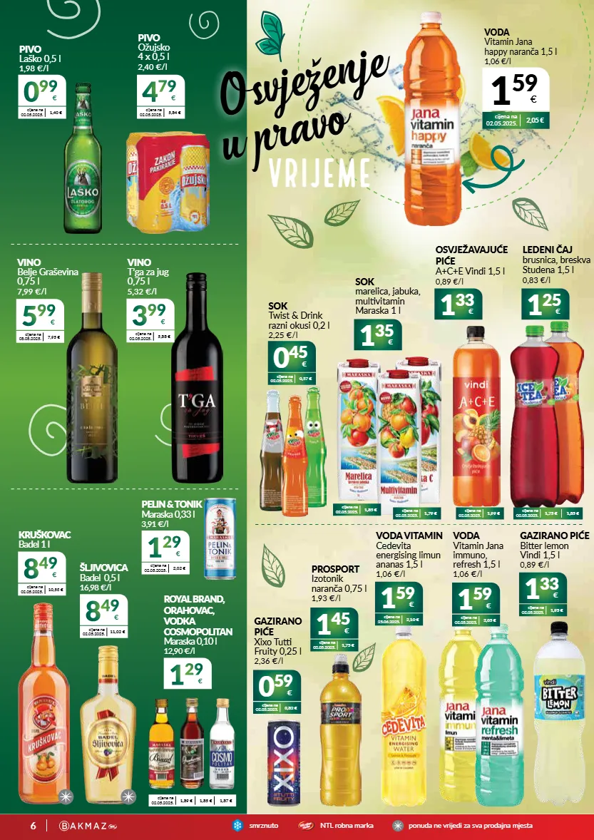 6 smrznutontl r o b n a m a r k a p o n u d a n e v r i j e d i z a s v a p r o d a j n a m j e s t a ntl robna marka 8 49 € cijena na 02.05.2025. 11,02 € šljivovica badel 0,5 l 16,98 €/l 1 29 € cijena na 02.05.2025. 2,02 € pelin & tonik maraska 0,33 l 3,91 €/l cijena na 02.05.2025. 10,53 € 8 49 € kruškovac badel 1 l voda vitamin jana happy naranča 1,5 l 1,06 €/l 1 59 € cijena na 02.05.2025. 2,05 € osvježenje u pravo vrijeme 1 25 € ledeni čaj brusnica, breskva studena 1,5 l 0,83 €/l cijena na 02.05.2025. 1,99 € 1 33 € osvježavajuće piće a+c+e vindi 1,5 l 0,89 €/l cijena na 02.05.2025. 1,85 € cijena na 02.05.2025. 1,79 € 1 35 € sok marelica, jabuka, multivitamin maraska 1 l 0 45 € cijena na 02.05.2025. 0,57 € sok twist & drink razni okusi 0,2 l 2,25 €/l cijena na 02.05.2025. 1,75 € 1,85 € 0 59 € cijena na 02.05.2025. 0,82 € gazirano piće xixo tutti fruity 0,25 l 2,36 €/l 1 33 € cijena na 02.05.2025. 1,95 € gazirano piće bitter lemon vindi 1,5 l 0,89 €/l 1 59 € cijena na 25.06.2025. 2,10 € voda vitamin cedevita energising limun ananas 1,5 l 1,06 €/l 1 59 € cijena na 02.05.2025. 2,05 € voda vitamin jana immuno, refresh 1,5 l 1,06 €/l 1 45 € cijena na 02.05.2025. 1,75 € prosport izotonik naranča 0,75 l 1,93 €/l 4 79 € cijena na 02.05.2025. 5,84 € pivo ožujsko 4 x 0,5 l 2,40 €/l 0 99 € cijena na 02.05.2025. 1,40 € pivo laško 0,5 l 1,98 €/l 5 99 € cijena na 08.08.2025. 7,95 € vino belje graševina 0,75 l 7,99 €/l 3 99 € cijena na 02.05.2025. 5,88 € vino t’ga za jug 0,75 l 5,32 €/l 1 29 € royal brand, orahovac, vodka cosmopolitan maraska 0,10 l 12,90 €/l cijena na 02.05.2025. 1,89 € 1,85 € 1,87 €