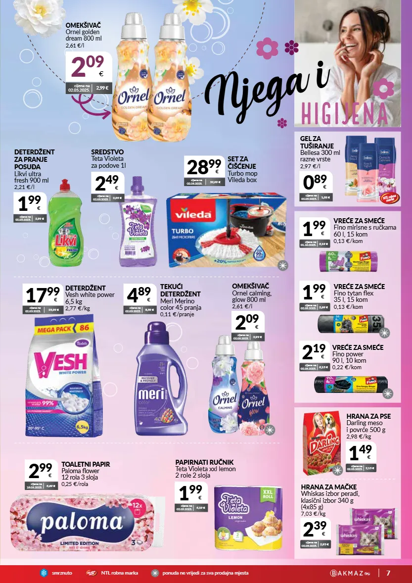 7 smrznuto ntl robna marka ponuda ne vrijedi za sva prodajna mjesta ntl robna marka 1 99 € cijena na 02.05.2025. 3,19 € papirnati ručnik teta violeta xxl lemon 2 role 2 sloja 2 99 € cijena na 19.05.2025. 3,69 € toaletni papir paloma flower 12 rola 3 sloja 0,25 €/rola njega i higijena gel za tuširanje bellesa 300 ml razne vrste 2,97 €/l 0 89 € cijena na 02.05.2025. 1,33 € 2 49 € cijena na 02.05.2025. 2,99 € sredstvo teta violeta za podove 1l 1 99 € cijena na 02.05.2025. 2,99 € deterdžent za pranje posuđa likvi ultra fresh 900 ml 2,21 €/l 28 99 € cijena na 02.05.2025. 52,99 € set za čišćenje turbo mop vileda box 17 99 € cijena na 02.05.2025. 25,99 € deterdžent vesh white power 6,5 kg 2,77 €/kg 4 89 € cijena na 02.05.2025. 8,59 € tekući deterdžent meri merino color 45 pranja 0,11 €/pranje 2 09 € cijena na 02.05.2025. 2,99 € omekšivač ornel calming, glow 800 ml 2,61 €/l cijena na 01.10.2025. 3,19 € 1 99 € vreće za smeće fino mirisne s ručkama 60 l, 15 kom 0,13 €/kom cijena na 02.05.2025. 2,69 € 1 99 € vreće za smeće fino tytan flex 35 l, 15 kom 0,13 €/kom cijena na 02.05.2025. 3,15 € 2 19 € vreće za smeće fino power 90 l, 10 kom 0,22 €/kom cijena na 02.05.2025. 2,95 € 2 39 € hrana za mačke whiskas izbor peradi, klasični izbor 340 g (4x85 g) 7,03 €/kg cijena na 02.05.2025. 2,15 € 1 49 € hrana za pse darling meso i povrće 500 g 2,98 €/kg ntl robna marka omekšivač ornel golden dream 800 ml 2,61 €/l 2 09 € cijena na 02.05.2025. 2,99 €