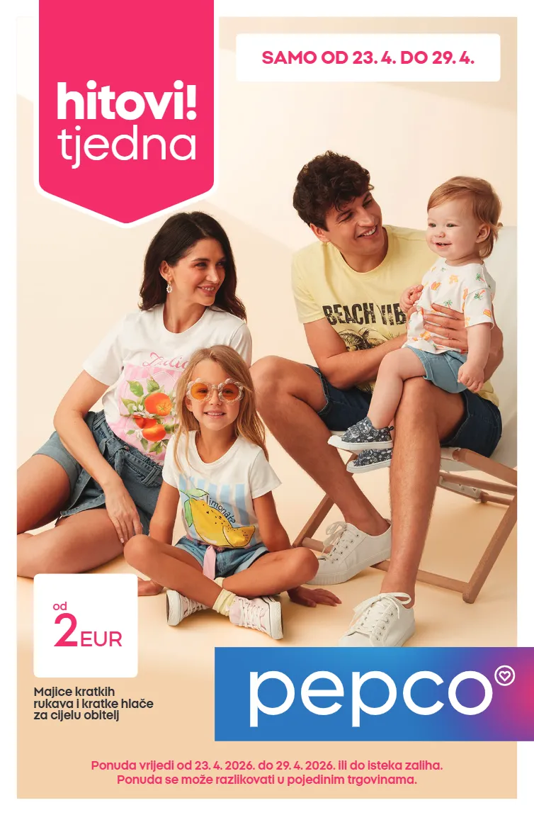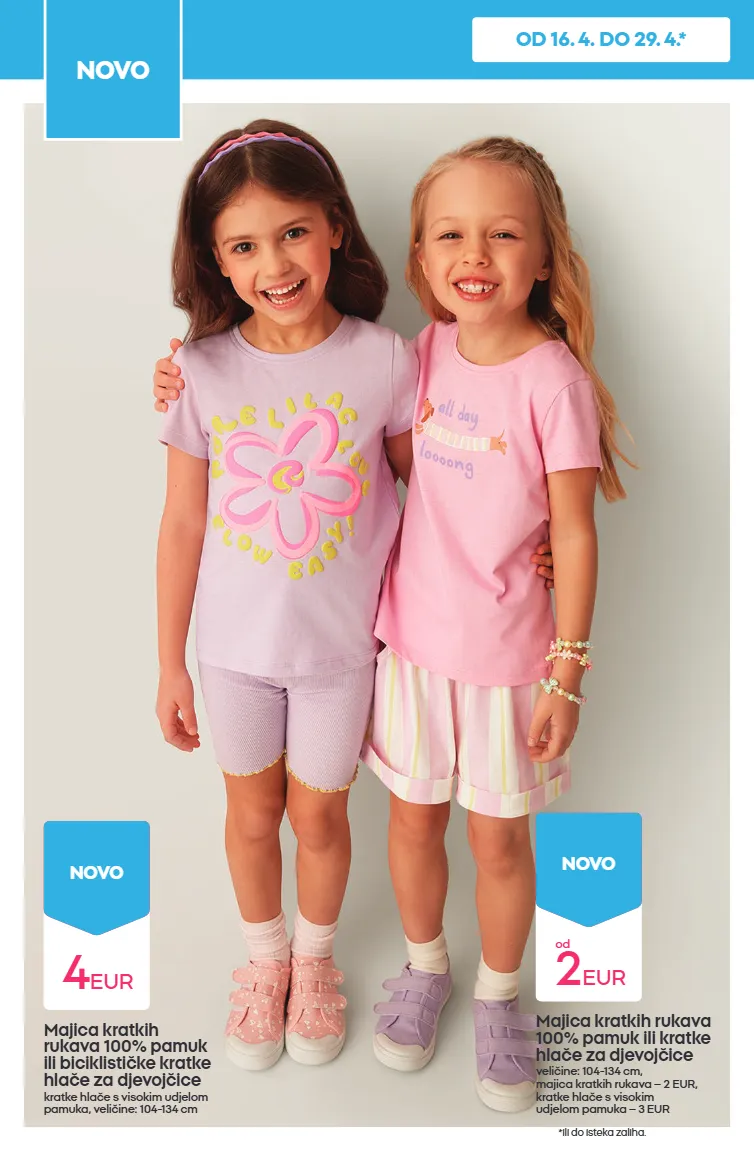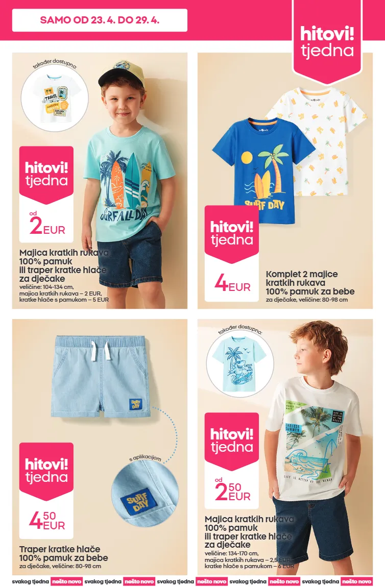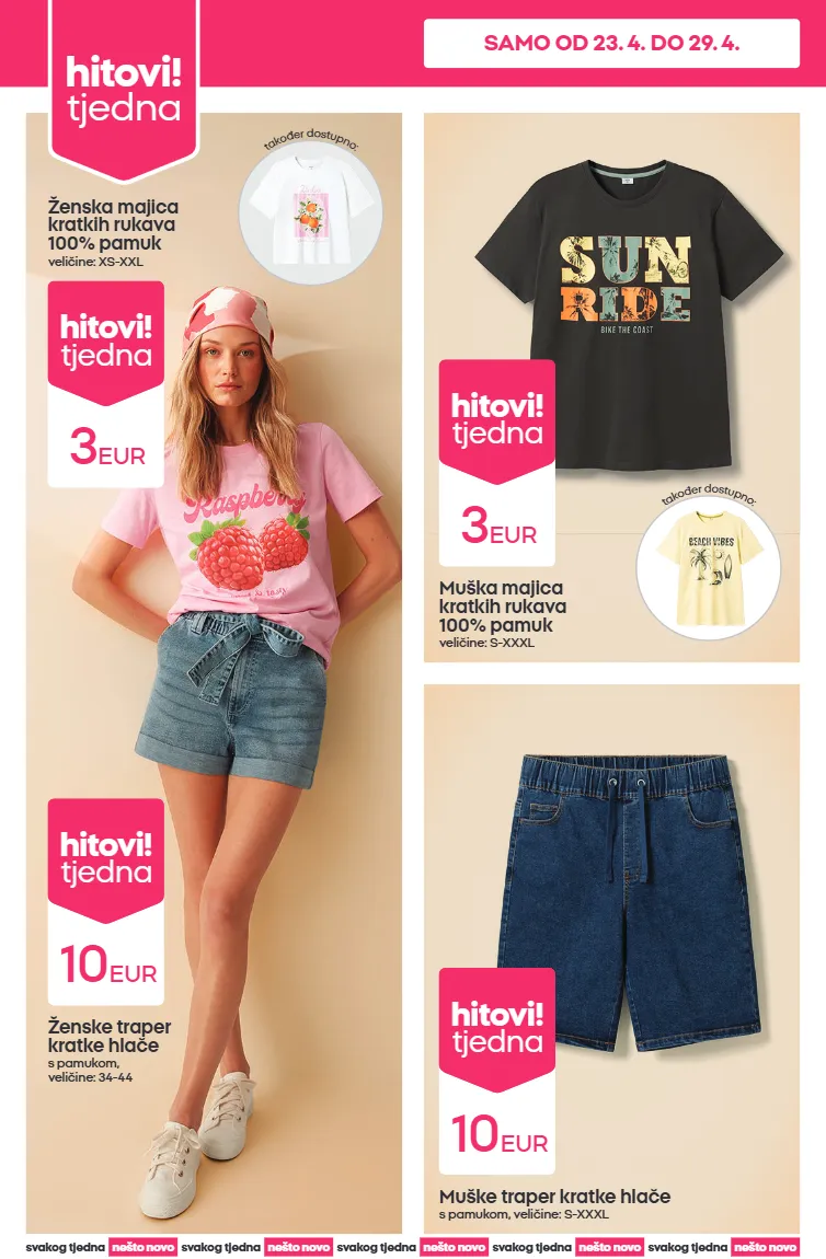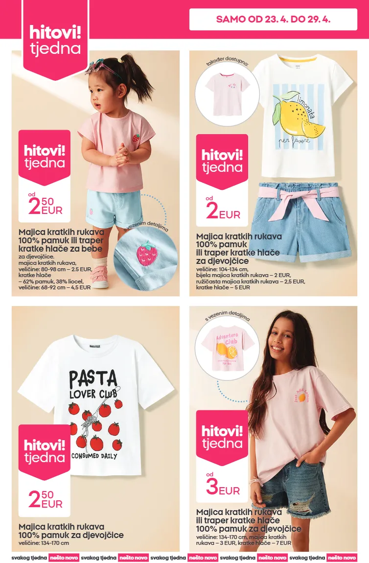 majice kratkih rukava i kratke hlače za cijelu obitelj od 2 eur hitovi! tjedna ponuda vrijedi od 23. 4. 2026. do 29. 4. 2026. ili do isteka zaliha. ponuda se može razlikovati u pojedinim trgovinama. samo od 23. 4. do 29. 4.