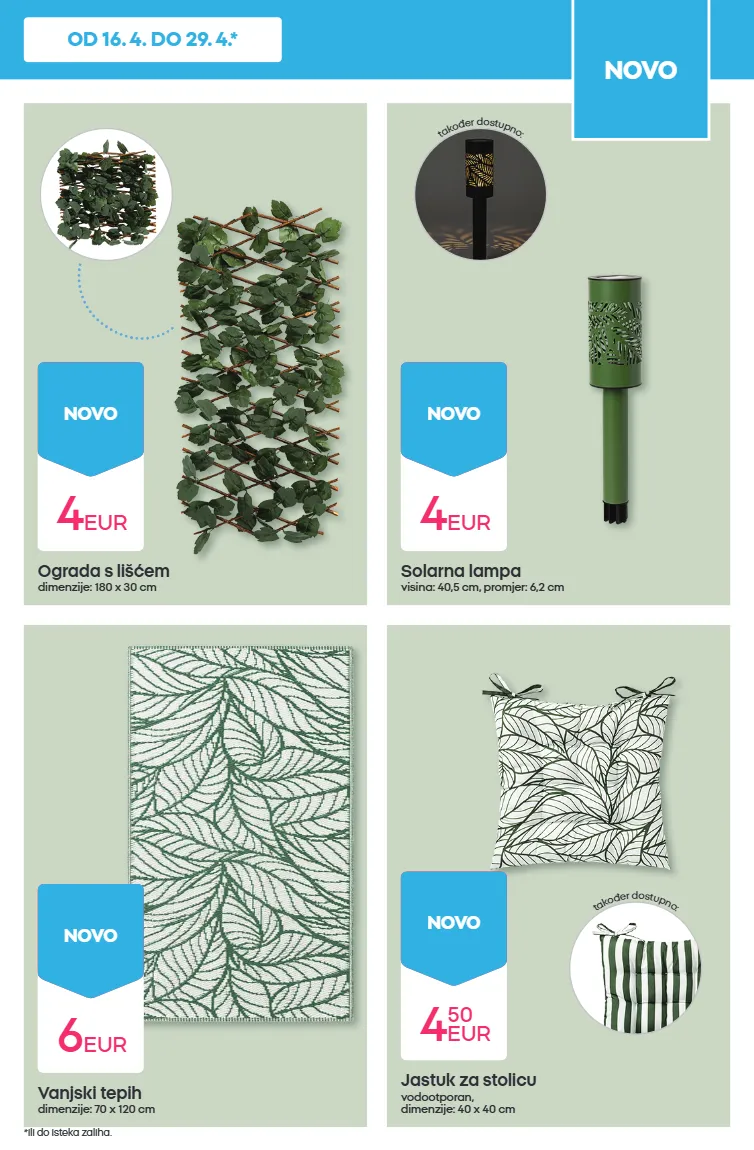 vanjski tepih dimenzije: 70 x 120 cm jastuk za stolicu vodootporan, dimenzije: 40 x 40 cm solarna lampa visina: 40,5 cm, promjer: 6,2 cm ograda s lišćem dimenzije: 180 x 30 cm 6 eur novo 4 50 eur novo 4 eur novo 4 eur novo t a k o đ e r d o s t u p n o : t a k o đ e r d o s t u p n o : novo *ili do isteka zaliha. od 16. 4. do 29. 4.*