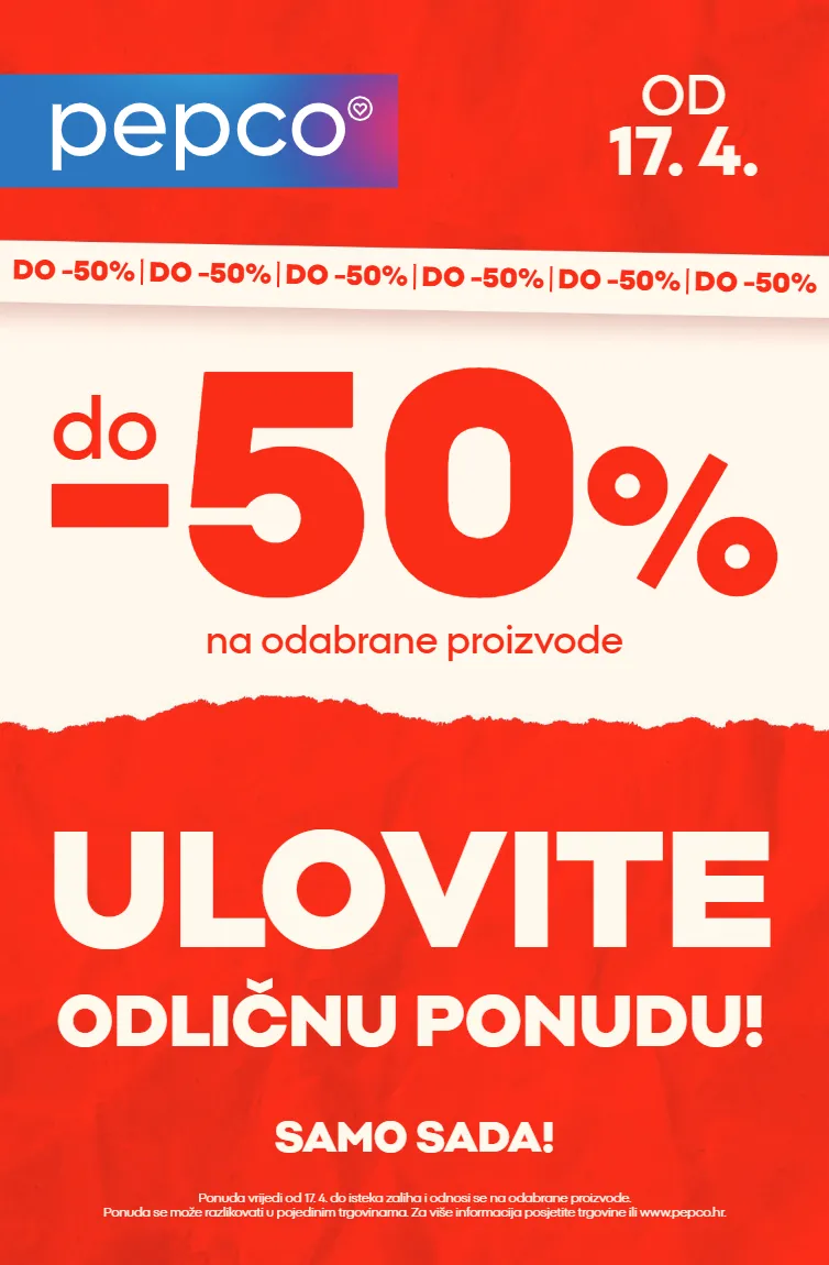 -50 % na odabrane proizvode do OD 17. 4. SAMO SADA! Ponuda vrijedi od 17. 4. do isteka zaliha i odnosi se na odabrane proizvode. Ponuda se može razlikovati u pojedinim trgovinama. Za više informacija posjetite trgovine ili www.pepco.hr. DO -50% DO -50% DO -50% DO -50% DO -50% DO -50% ULOVITE ODLIČNU PONUDU!