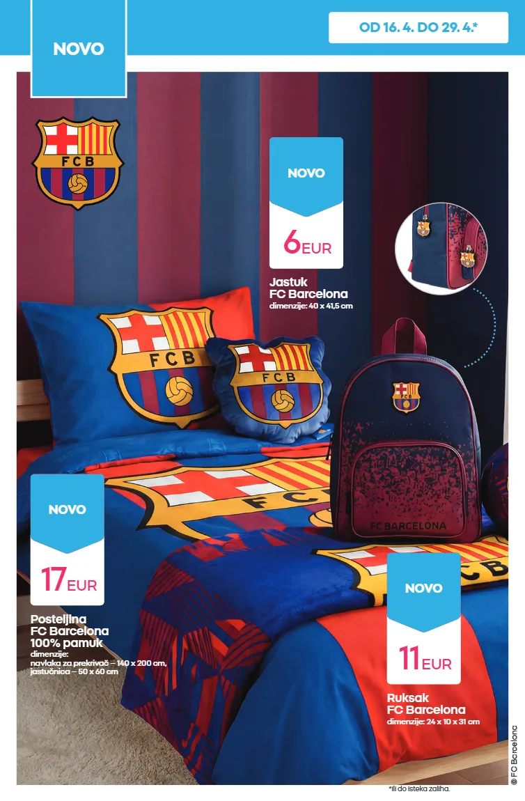 © fc barcelona jastuk fc barcelona dimenzije: 40 x 41,5 cm posteljina fc barcelona 100% pamuk dimenzije: navlaka za prekrivač – 140 x 200 cm, jastučnica – 50 x 60 cm ruksak fc barcelona dimenzije: 24 x 10 x 31 cm 11 eur novo 6 eur novo 17 eur novo novo *ili do isteka zaliha. od 16. 4. do 29. 4.*