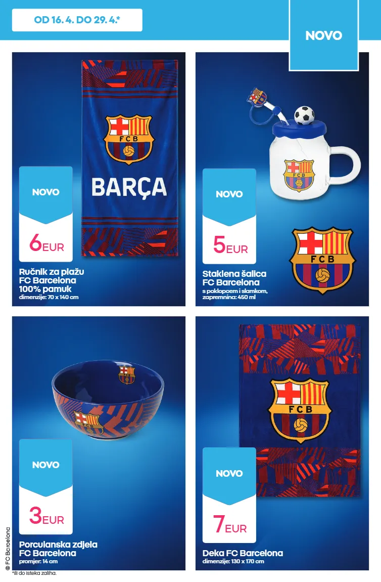 © fc barcelona ručnik za plažu fc barcelona 100% pamuk dimenzije: 70 x 140 cm porculanska zdjela fc barcelona promjer: 14 cm staklena šalica fc barcelona s poklopcem i slamkom, zapremnina: 450 ml deka fc barcelona dimenzije: 130 x 170 cm 6 eur novo 3 eur novo 5 eur novo 7 eur novo novo *ili do isteka zaliha. od 16. 4. do 29. 4.*