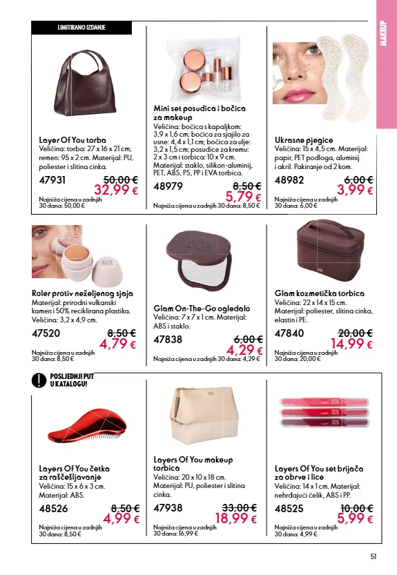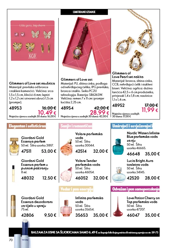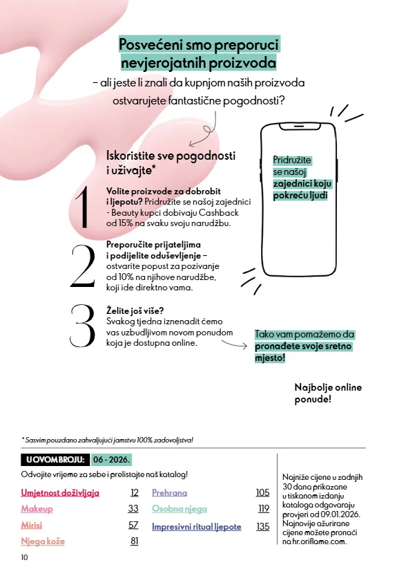 10 Tako vam pomažemo da pronađete svoje sretno mjesto! Odvojite vrijeme za sebe i prelistajte naš katalog! Posvećeni smo preporuci nevjerojatnih proizvoda – ali jeste li znali da kupnjom naših proizvoda ostvarujete fantastične pogodnosti? Iskoristite sve pogodnosti i uživajte* Preporučite prijateljima i podijelite oduševljenje – ostvarite popust za pozivanje od 10% na njihove narudžbe, koji ide direktno vama. Želite još više? Svakog tjedna iznenadit ćemo vas uzbudljivom novom ponudom koja je dostupna online. Volite proizvode za dobrobit i ljepotu? Pridružite se našoj zajednici - Beauty kupci dobivaju Cashback od 15% na svaku svoju narudžbu. Pridružite se našoj zajednici koju pokreću ljudi U OVOM BROJU: 06 - 2026. Najniže cijene u zadnjih 30 dana prikazane u tiskanom izdanju kataloga odgovaraju provjeri od 09.01.2026. Najnovije ažurirane cijene možete pronaći na hr.oriflame.com. * Sasvim pouzdano zahvaljujući jamstvu 100% zadovoljstva! Najbolje online ponude! Makeup Mirisi Prehrana Umjetnost doživljaja Impresivni ritual ljepote Njega kože Osobna njega 12 33 57 81 105 119 135
