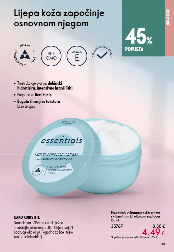 101 • Bogata i hranjiva tekstura brzo se upija • Pogodna za lice i tijelo • Trostruko djelovanje: dubinski hidratizira, intenzivno hrani i štiti BEZ GMO VITAMIN E D E R M A T O L O Š K I I S P I T A N O H I D R A T I Z I R A Š T I T I H R A N I Lijepa koža započinje osnovnom njegom NJEGA KOŽE Essentials višenamjenska krema s vitaminom E i uljanom repicom 150 ml. 35767 8,50 € 4,49 € Najniža cijena u zadnjih 30 dana: 3,99 € Nanesite na očišćenu kožu i nježno umasirajte vrhovima prstiju, izbjegavajući područje oko očiju. Pogodna za lice i tijelo kao i za cijelu obitelj. KAKO KORISTITI: 45 % POPUSTA
