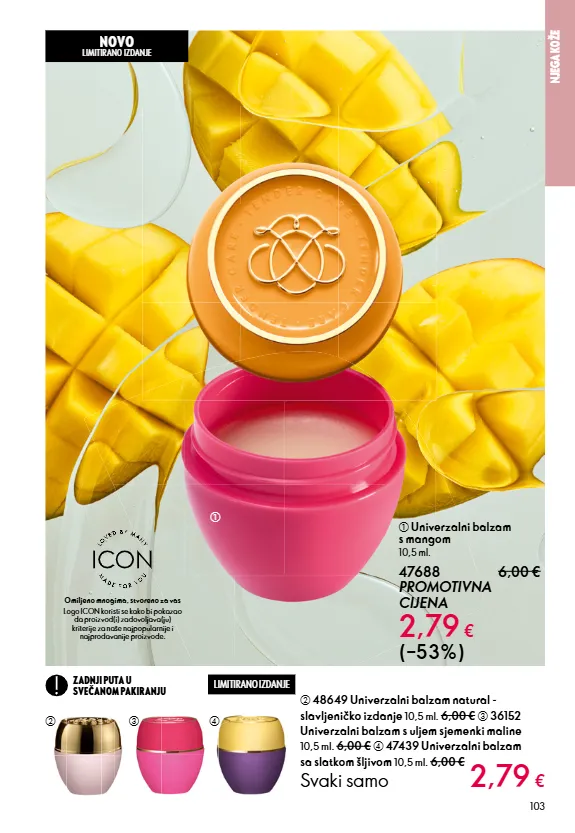 102 SLATKI DAŠAK LJETA Favorit Oriflame potrošača, Univerzalni balzam je kompaktni i učinkoviti proizvod koji hidratizira i hrani suhu kožu. Uživajte u novom izdanju sa sočnim mangom - slatkim poput zlatnog zalaska sunca . O RI FL A M E KU LTN I PRO IZ VO D