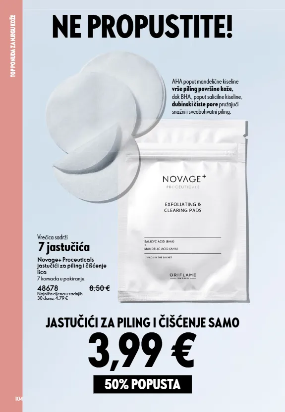 104 NE PROPUSTITE! TOP PONUDA ZA NJEGU KOŽE 3,99€ Novage+ Proceuticals jastučići za piling i čišćenje lica 7 komada u pakiranju. 48678 8,50 € Najniža cijena u zadnjih 30 dana: 4,79 € AHA poput mandelične kiseline vrše piling površine kože, dok BHA, poput salicilne kiseline, dubinski čiste pore pružajući snažni i sveobuhvatni piling. JASTUČIĆI ZA PILING I ČIŠĆENJE SAMO 50% POPUSTA Vrećica sadrži 7 jastučića