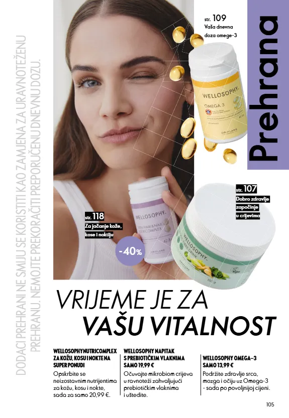 105 Prehrana DODACI PREHRANI NE SMIJU SE KORISTITI KAO ZAMJENA ZA URAVNOTEŽENU PREHRANU. NEMOJTE PREKORAČITI PREPORUČENU DNEVNU DOZU. Podržite zdravlje srca, mozga i očiju uz Omega-3 - sada po povoljnijoj cijeni. -40 % str. 107 str. 118 str. 109 Za jačanje kože, kose i noktiju Dobro zdravlje započinje u crijevima Vaša dnevna doza omege-3 WELLOSOPHY OMEGA−3 SAMO 13,99 € WELLOSOPHY NUTRICOMPLEX ZA KOŽU, KOSU I NOKTE NA SUPER PONUDI Opskrbite se neizostavnim nutrijentima za kožu, kosu i nokte, sada za samo 20,99 €. WELLOSOPHY NAPITAK S PREBIOTIČKIM VLAKNIMA SAMO 19,99 € Očuvajte mikrobiom crijeva u ravnoteži zahvaljujući prebiotičkim vlaknima i uštedite. VRIJEME JE ZA VAŠU VITALNOST