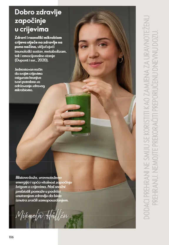 106 Zdravi i raznoliki mikrobiom crijeva utječe na zdravlje na puno načina, uključujući imunološki sustav, metabolizam, tek i emocijonalno stanje (Dupont i sur., 2020). Dobro zdravlje započinje u crijevima Jednostavan način da svojim crijevima osigurate hranjive tvari potrebne za održavanje zdravog mikrobioma. Blistava koža, uravnotežena energija i opća vitalnost započinju brigom o crijevima. Naš snažni prebiotik pomaže u podršci unutarnjem zdravlju da biste iznutra zračili samopouzdanjem. DODACI PREHRANI NE SMIJU SE KORISTITI KAO ZAMJENA ZA URAVNOTEŽENU PREHRANU. NEMOJTE PREKORAČITI PREPORUČENU DNEVNU DOZU.