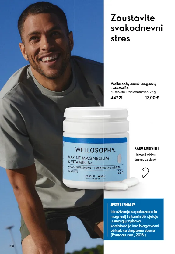 108 JESTE LI ZNALI? Wellosophy morski magnezij i vitamin B6 30 tableta. 1 tableta dnevno. 22 g. 44221 17,00 Zaustavite svakodnevni stres Uzimati 1 tabletu dnevno uz obrok KAKO KORISTITI: Istraživanja su pokazala da magnezij i vitamin B6 djeluju u sinergiji; njihova kombinacija ima blagotvorni učinak na simptome stresa (Pouteau i sur., 2018.).