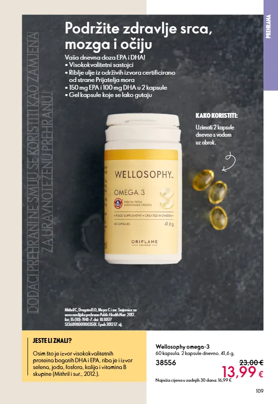 section name 109 prehrana kako koristiti: uzimati 2 kapsule dnevno s vodom uz obrok. wellosophy omega-3 60 kapsula. 2 kapsule dnevno. 41,6 g. 38556 23,00 € 13,99 € najniža cijena u zadnjih 30 dana: 16,99 € jeste li znali? osim što je izvor visokokvalitetnih proteina bogatih dha i epa, riba je i izvor selena, joda, fosfora, kalija i vitamina b skupine (mithril i sur., 2012.). podržite zdravlje srca, mozga i očiju mithril c, dragsted lo, meyer c i sur. smjernice za novu nordijsku prehranu public health nutr. 2012. list; 15 (10): 1941−7. doi: 10.1017/ s136898001100351x. epub 2012 17. sij. vaša dnevna doza epa i dha! • visokokvalitetni sastojci • riblje ulje iz održivih izvora certificirano od strane prijatelja mora • 150 mg epa i 100 mg dha u 2 kapsule • gel kapsule koje se lako gutaju dodaci prehrani ne smiju se koristiti kao zamjena za uravnoteženu prehranu.