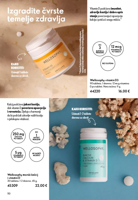 110 wellosophy vitamin d3 90 tableta. 1 dnevno. 12 mcg vitamina d po tableti. neto težina: 9 g. 44220 16,00 wellosophy morski kalcij i vitamin d 30 tableta. 1-2 dnevno. 45 g. 45309 22,00 € ne sadrži mlijeko do 1 mjesec primjene 5 μg vitamina d po tableti 250 mg kalcija po tableti kalcij podržava jakost kostiju, dok vitamin d povećava apsorpciju i ravnotežu. djeluju u harmoniji da bi podržali zdravlje vaših kostiju i cjelokupnu vitalnost. uzimati 1−2 tablete dnevno uz obrok kako koristiti: vitamin d podržava imunitet, zdravlje kostiju i dobro opće stanje povećavajući apsorpciju kalcija i potičući snagu mišića.* uzimati 1 tabletu dnevno uz obrok. kako koristiti: bez glutena 12 mcg vitamina d3 po tableti do 3 mjeseca primjene izgradite čvrste temelje zdravlja * vitamin d doprinosi normalnoj funkciji imunološkog sustava, normalnoj funkciji mišića i održavanju normalnog stanja kostiju i zuba.