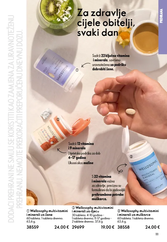 111 PREHRANA a Wellosophy multivitamini i minerali za žene 60 tableta. 1 tableta dnevno. 63,6 g. 38559 24,00 € b Wellosophy multivitamini i minerali za djecu 30 tableta. 4-10 godina – 1 tableta dnevno; 11-17 godina – 2 tablete dnevno. 37,6 g 29699 19,00 € c Wellosophy multivitamini i minerali za muškarce 60 tableta. 1 tableta dnevno. 63,6 g. 38558 24,00 a b c Dijetetska podrška za dob 4−17 godina Sadrži 13 vitamina i 9 minerala Ukusni okus maline Za zdravlje cijele obitelji, svaki dan S 22 vitamina i minerala važna za zdravlje, precizno su formulirani da bi zadovoljili prehrambene potrebe muškarca. Sadrži 22 ključna vitamina i minerala , savršeno uravnotežena za podršku dobrobiti žene. DODACI PREHRANI NE SMIJU SE KORISTITI KAO ZAMJENA ZA URAVNOTEŽENU PREHRANU. NEMOJTE PREKORAČITI PREPORUČENU DNEVNU DOZU.