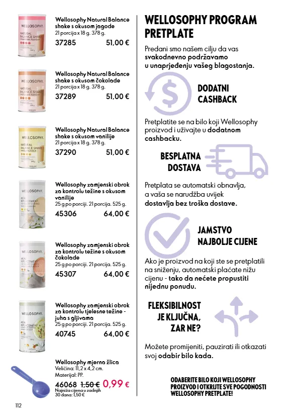 112 Predani smo našem cilju da vas svakodnevno podržavamo u unaprjeđenju vašeg blagostanja. Pretplata se automatski obnavlja, a vaša se narudžba uvijek dostavlja bez troška dostave. FLEKSIBILNOST JE KLJUČNA, ZAR NE? ODABERITE BILO KOJI WELLOSOPHY PROIZVOD I OTKRIJTE SVE POGODNOSTI WELLOSOPHY PRETPLATE! Pretplatite se na bilo koji Wellosophy proizvod i uživajte u dodatnom cashbacku. DODATNI CASHBACK BESPLATNA DOSTAVA JAMSTVO NAJBOLJE CIJENE Ako je proizvod na koji ste se pretplatili na sniženju, automatski plaćate nižu cijenu - tako da nećete propustiti nijednu ponudu. Možete promijeniti, pauzirati ili otkazati svoj odabir bilo kada. WELLOSOPHY PROGRAM PRETPLATE Wellosophy Natural Balance shake s okusom jagode 21 porcija x 18 g. 378 g. 37285 51,00 € Wellosophy Natural Balance shake s okusom čokolade 21 porcija x 18 g. 378 g. 37289 51,00 € Wellosophy Natural Balance shake s okusom vanilije 21 porcija x 18 g. 378 g. 37290 51,00 € Wellosophy zamjenski obrok za kontrolu tjelesne težine - juha s gljivama 25 g po porciji. 21 porcija. 525 g. 40745 64,00 € Wellosophy zamjenski obrok za kontrolu težine s okusom vanilije 25 g po porciji. 21 porcija. 525 g. 45306 64,00 € Wellosophy zamjenski obrok za kontrolu težine s okusom čokolade 25 g po porciji. 21 porcija. 525 g. 45307 64,00 € Wellosophy mjerna žlica Veličina: 11,2 x 4,2 cm. Materijal: PP. 46068 1,50 € 0,99 € Najniža cijena u zadnjih 30 dana: 1,50 €