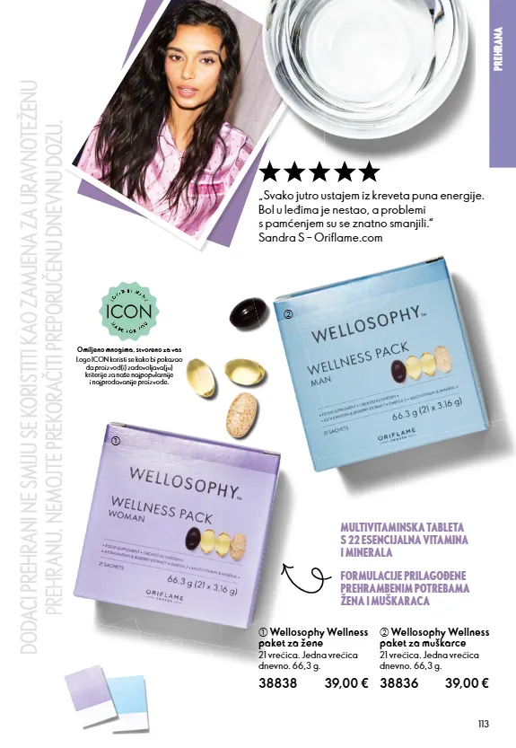 113 PREHRANA a Wellosophy Wellness paket za žene 21 vrećica. Jedna vrećica dnevno. 66,3 g. 38838 39,00 € b Wellosophy Wellness paket za muškarce 21 vrećica. Jedna vrećica dnevno. 66,3 g. 38836 39,00 € MULTIVITAMINSKA TABLETA S 22 ESENCIJALNA VITAMINA I MINERALA FORMULACIJE PRILAGOĐENE PREHRAMBENIM POTREBAMA ŽENA I MUŠKARACA „Svako jutro ustajem iz kreveta puna energije. Bol u leđima je nestao, a problemi s pamćenjem su se znatno smanjili.“ Sandra S – Oriflame.com Logo ICON koristi se kako bi pokazao da proizvod(i) zadovoljava(ju) kriterije za naše najpopularnije i najprodavanije proizvode. Omiljeno mnogima, stvoreno za vas a b DODACI PREHRANI NE SMIJU SE KORISTITI KAO ZAMJENA ZA URAVNOTEŽENU DODACI PREHRANI NE SMIJU SE KORISTITI KAO ZAMJENA ZA URAVNOTEŽENU PREHRANU. NEMOJTE PREKORAČITI PREPORUČENU DNEVNU DOZU. PREHRANU. NEMOJTE PREKORAČITI PREPORUČENU DNEVNU DOZU. PREHRANU. NEMOJTE PREKORAČITI PREPORUČENU DNEVNU DOZU.