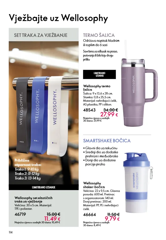 114 Wellosophy shaker-bočica Veličina: 22 x 9,5 cm. Glavna posuda: 600 ml. Pretinac s organizatorom: 140 ml. Donji pretinac: 200 ml. Materijal: PP, PE i nehrđajući čelik. 46664 11,50 € 9,79 € Najniža cijena u zadnjih 30 dana: 8,49 € • Glavni dio za tekućinu • Srednji dio za dodatke prehrani i međuobroke • Donji dio za dodatne porcije praha LIMITIRANO IZDANJE Wellosophy termo šalica Šalica: 9 x 13,6 x 28 cm. Slamka: 0,8 x 25,5 cm. Materijal: nehrđajući čelik, AS plastika, PP i silikon. 48543 34,00 € 27,99 € Najniža cijena u zadnjih 30 dana: 21,99 € Održava napitak hladnim ili toplim do 6 sati Savršena za odlazak na posao, putovanja ili bilo koju drugu priliku TERMO ŠALICA SMARTSHAKE BOČICA Vježbajte uz Wellosophy LIMITIRANO IZDANJE Wellosophy set elastičnih traka za vježbanje Veličina: 30 x 5 cm. Materijal: TPE i poliester. 46719 15,00 € 11,49 € Najniža cijena u zadnjih 30 dana: 10,49 € Približna otpornost traka: Traka 1: 9-10 kg Traka 2: 11-12 kg Traka 3: 13-14 kg SET TRAKA ZA VJEŽBANJE
