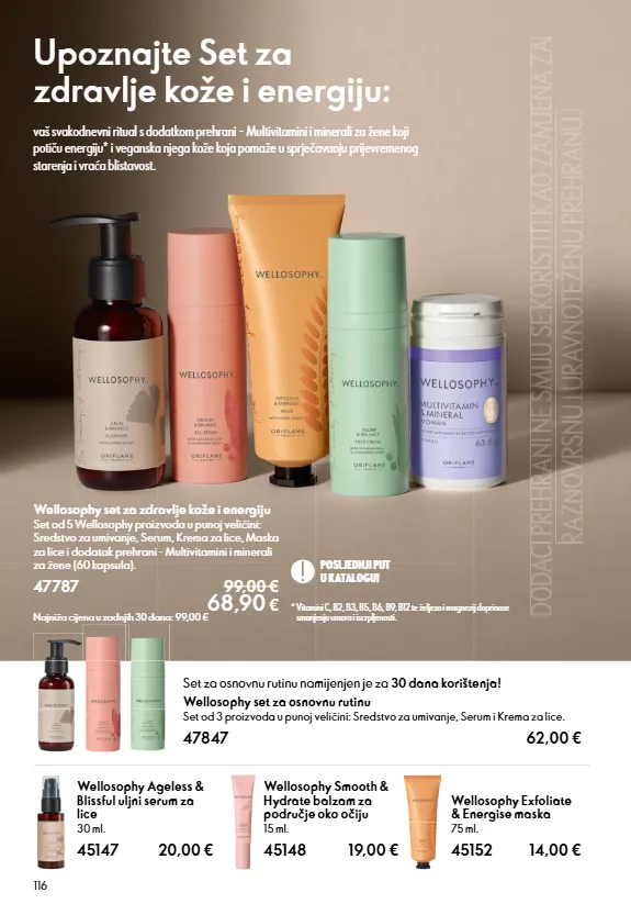 116 wellosophy exfoliate & energise maska 75 ml. 45152 14,00 € wellosophy smooth & hydrate balzam za područje oko očiju 15 ml. 45148 19,00 € wellosophy ageless & blissful uljni serum za lice 30 ml. 45147 20,00 € wellosophy set za osnovnu rutinu set od 3 proizvoda u punoj veličini: sredstvo za umivanje, serum i krema za lice. 47847 62,00 set za osnovnu rutinu namijenjen je za 30 dana korištenja! dodaci prehrani ne smiju se koristiti kao zamjena za dodaci prehrani ne smiju se koristiti kao zamjena za raznovrsnu i uravnoteženu prehranu. raznovrsnu i uravnoteženu prehranu. wellosophy set za zdravlje kože i energiju set od 5 wellosophy proizvoda u punoj veličini: sredstvo za umivanje, serum, krema za lice, maska za lice i dodatak prehrani - multivitamini i minerali za žene (60 kapsula). 47787 99,00 € 68,90 € najniža cijena u zadnjih 30 dana: 99,00 € posljednji put u katalogu! upoznajte set za zdravlje kože i energiju: vaš svakodnevni ritual s dodatkom prehrani - multivitamini i minerali za žene koji potiču energiju* i veganska njega kože koja pomaže u sprječavanju prijevremenog starenja i vraća blistavost. * vitamini c, b2, b3, b5, b6, b9, b12 te željezo i magnezij doprinose smanjenju umora i iscrpljenosti.