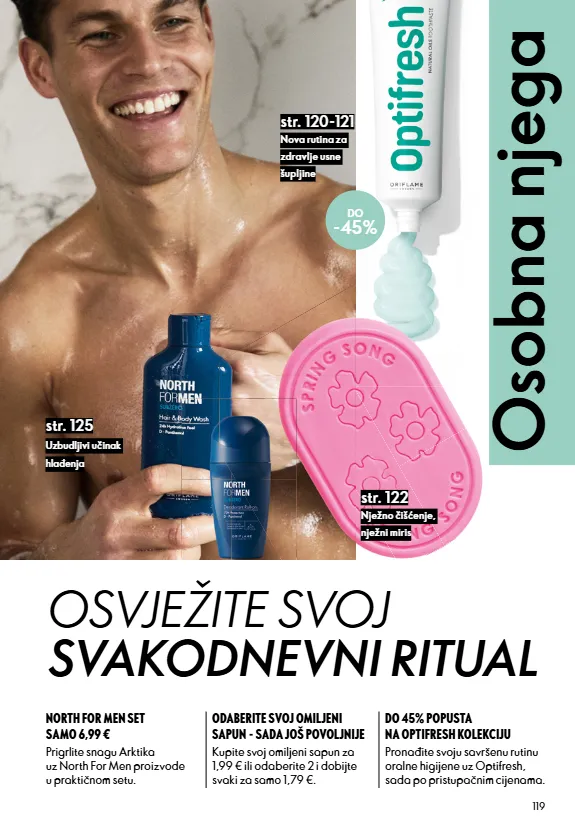 119 osobna njega str. 122 str. 125 str. 120-121 do -45% uzbudljivi učinak hlađenja nježno čišćenje, nježni miris nova rutina za zdravlje usne šupljine osvježite svoj svakodnevni ritual north for men set samo 6,99 € prigrlite snagu arktika uz north for men proizvode u praktičnom setu. odaberite svoj omiljeni sapun - sada još povoljnije kupite svoj omiljeni sapun za 1,99 € ili odaberite 2 i dobijte svaki za samo 1,79 €. do 45% popusta na optifresh kolekciju pronađite svoju savršenu rutinu oralne higijene uz optifresh, sada po pristupačnim cijenama.