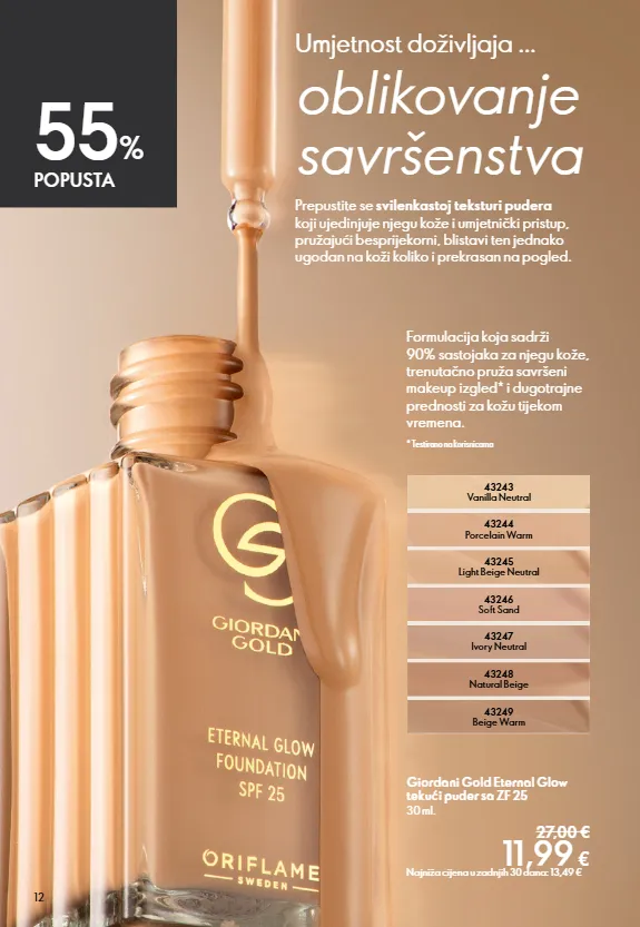 12 Giordani Gold Eternal Glow tekući puder sa ZF 25 30 ml. 27,00 € 11,99 € Najniža cijena u zadnjih 30 dana: 13,49 € 55 % POPUSTA Umjetnost doživljaja ... oblikovanje savršenstva Formulacija koja sadrži 90% sastojaka za njegu kože, trenutačno pruža savršeni makeup izgled* i dugotrajne prednosti za kožu tijekom vremena. * Testirano na korisnicama Prepustite se svilenkastoj teksturi pudera koji ujedinjuje njegu kože i umjetnički pristup, pružajući besprijekorni, blistavi ten jednako ugodan na koži koliko i prekrasan na pogled. 43247 Ivory Neutral 43243 Vanilla Neutral 43249 Beige Warm 43248 Natural Beige 43246 Soft Sand 43245 Light Beige Neutral 43244 Porcelain Warm